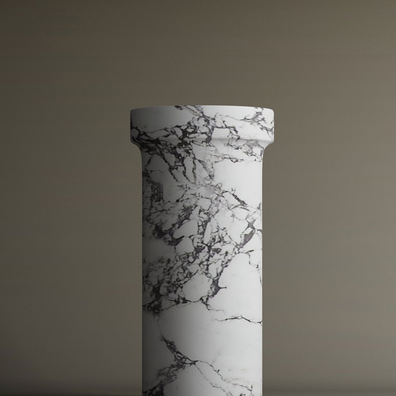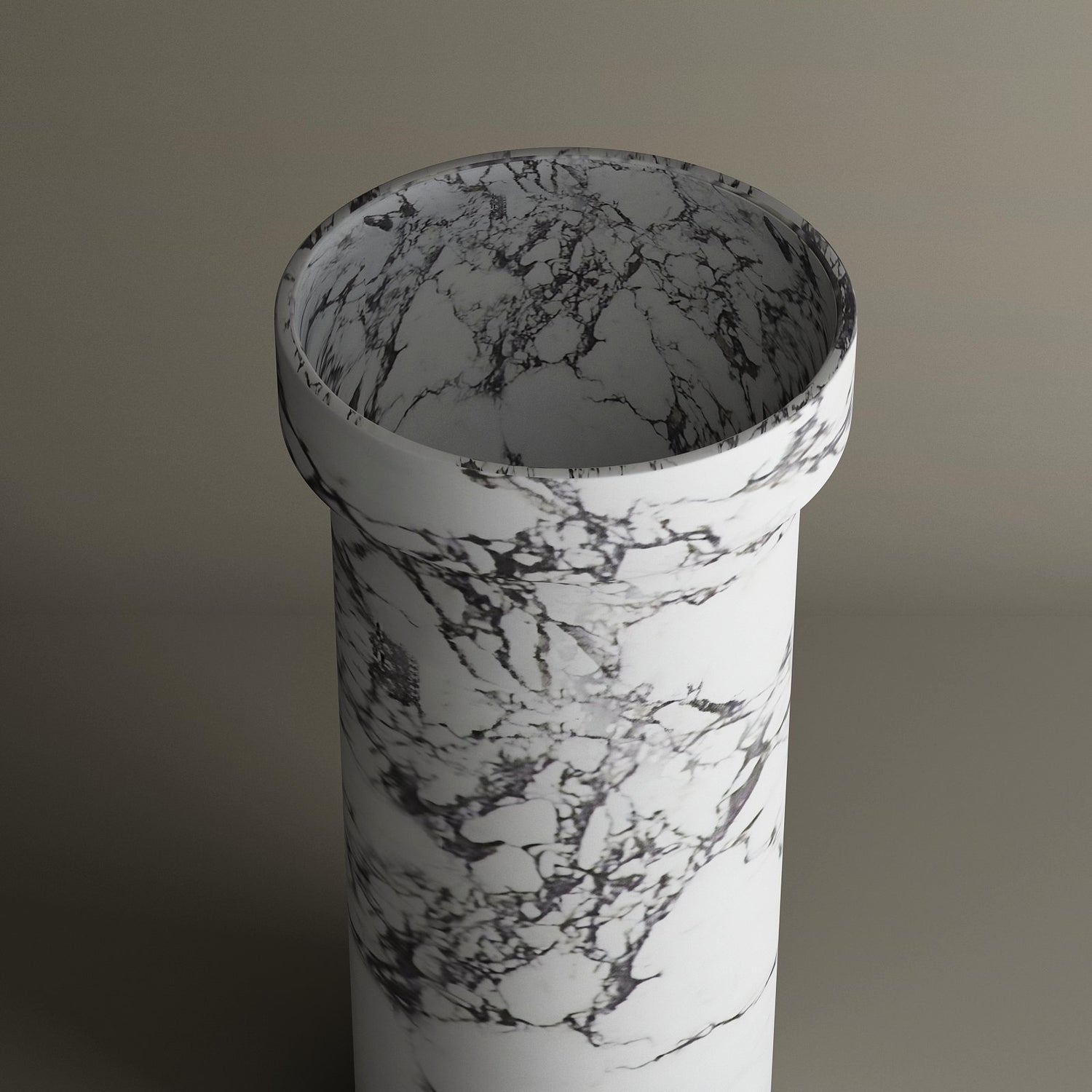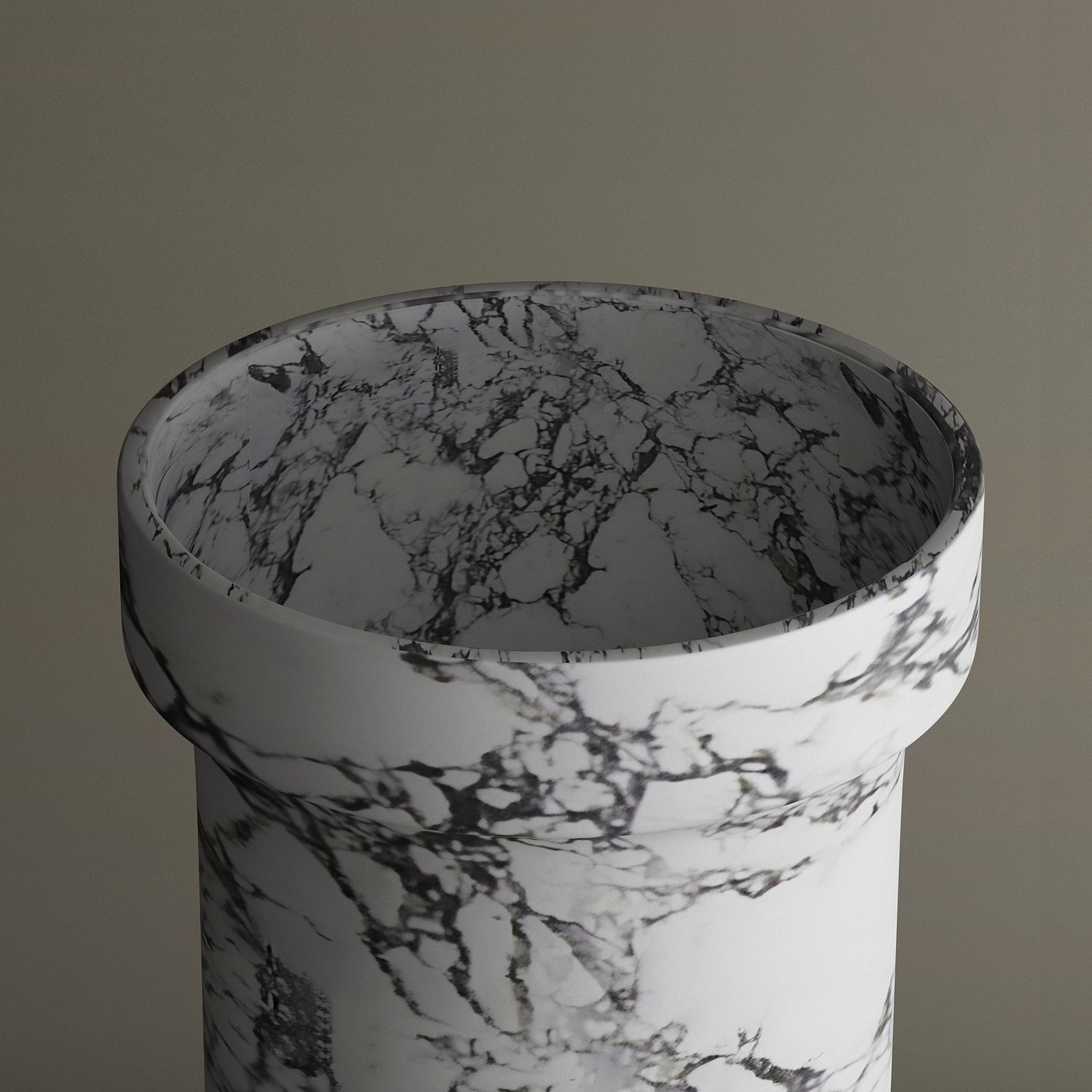 The cylindrical body provides a strong architectural form, softened by the natural veining of Calacatta Viola marble.