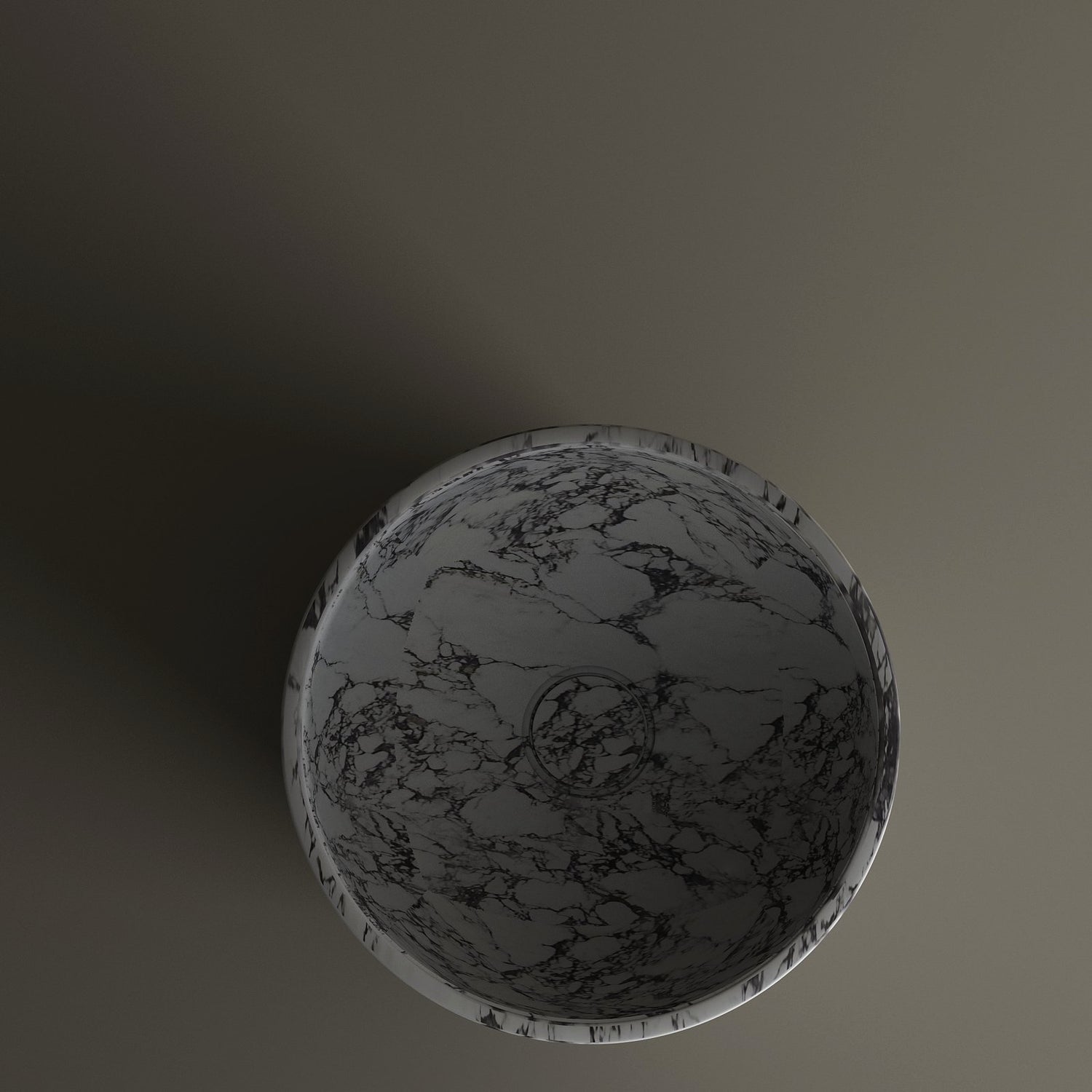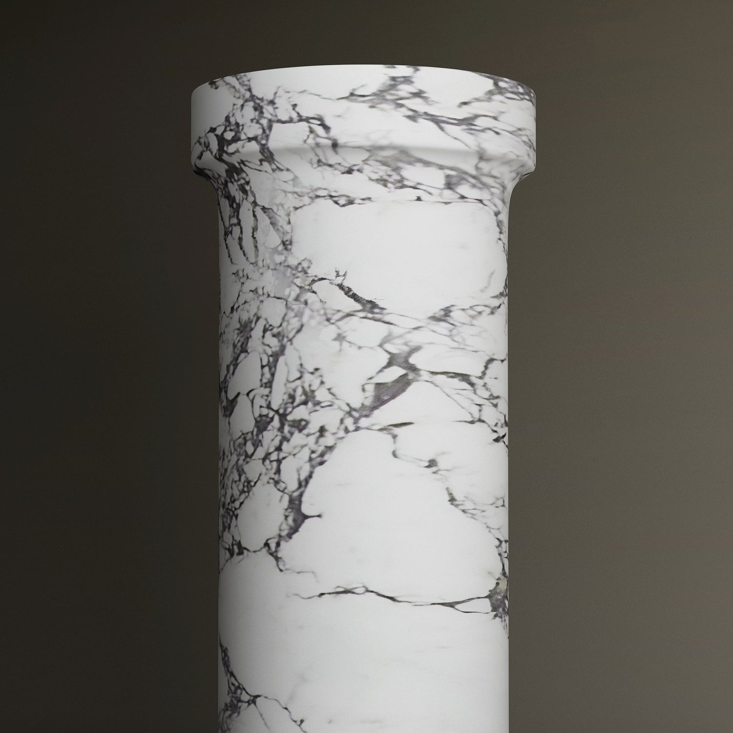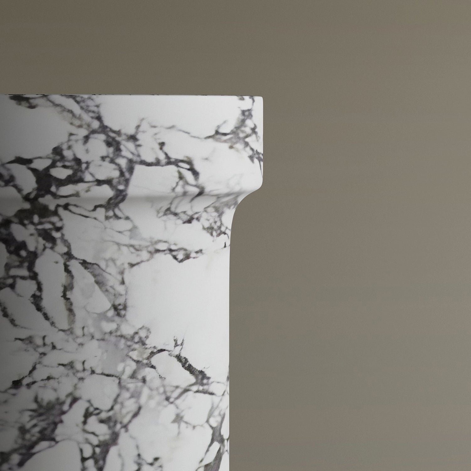 The cylindrical body provides a strong architectural form, softened by the natural veining of Calacatta Viola marble.