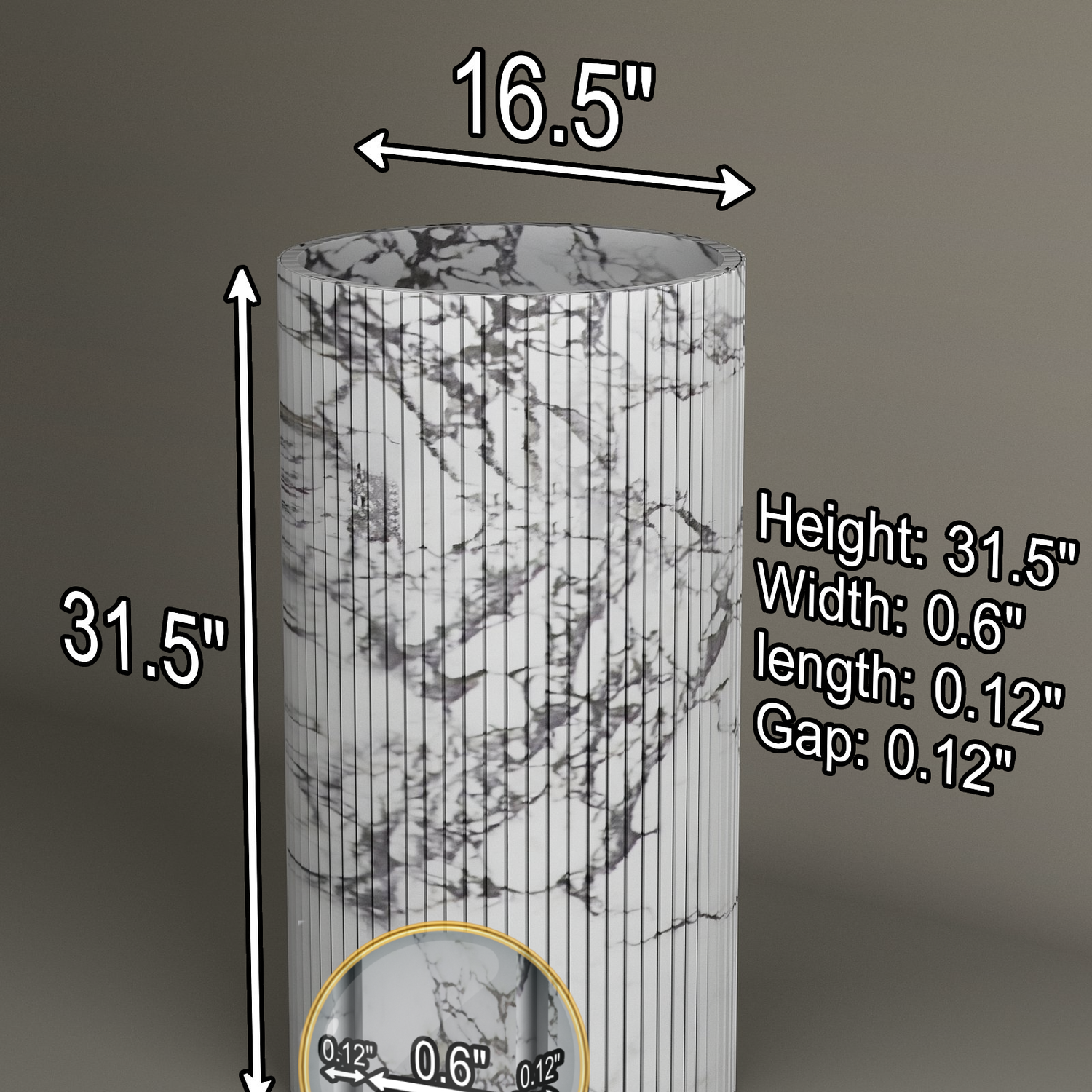This pedestal vanity stands at 31.5" (800 mm) in height, with a 16.5" (420 mm) diameter that offers a balanced footprint for both compact and spacious bathrooms. Each fluted detail is carved with precision — 0.6" (15 mm) in width and 0.12" (3 mm) in depth, separated by a 0.12" (3 mm) gap, creating rhythmic shadows that enhance the natural veining of the marble.