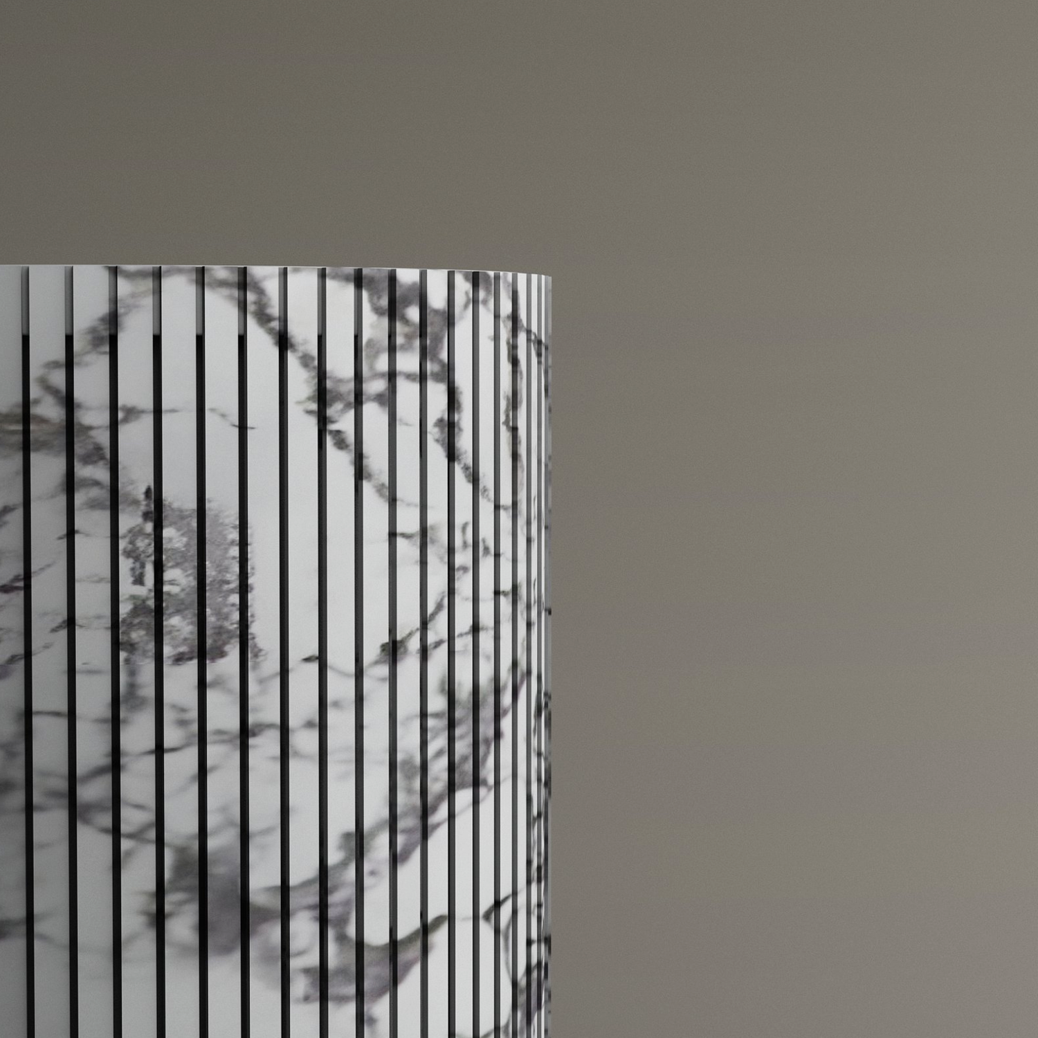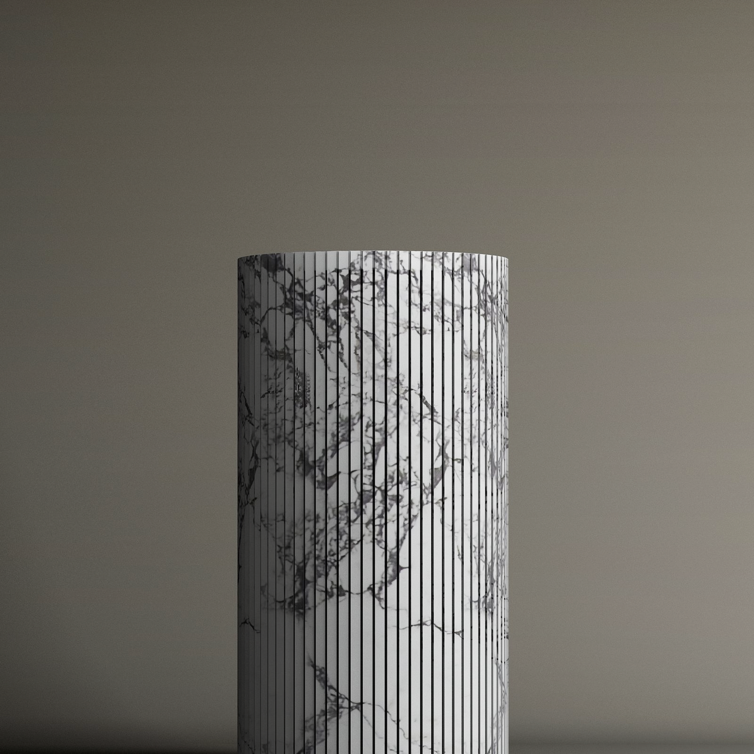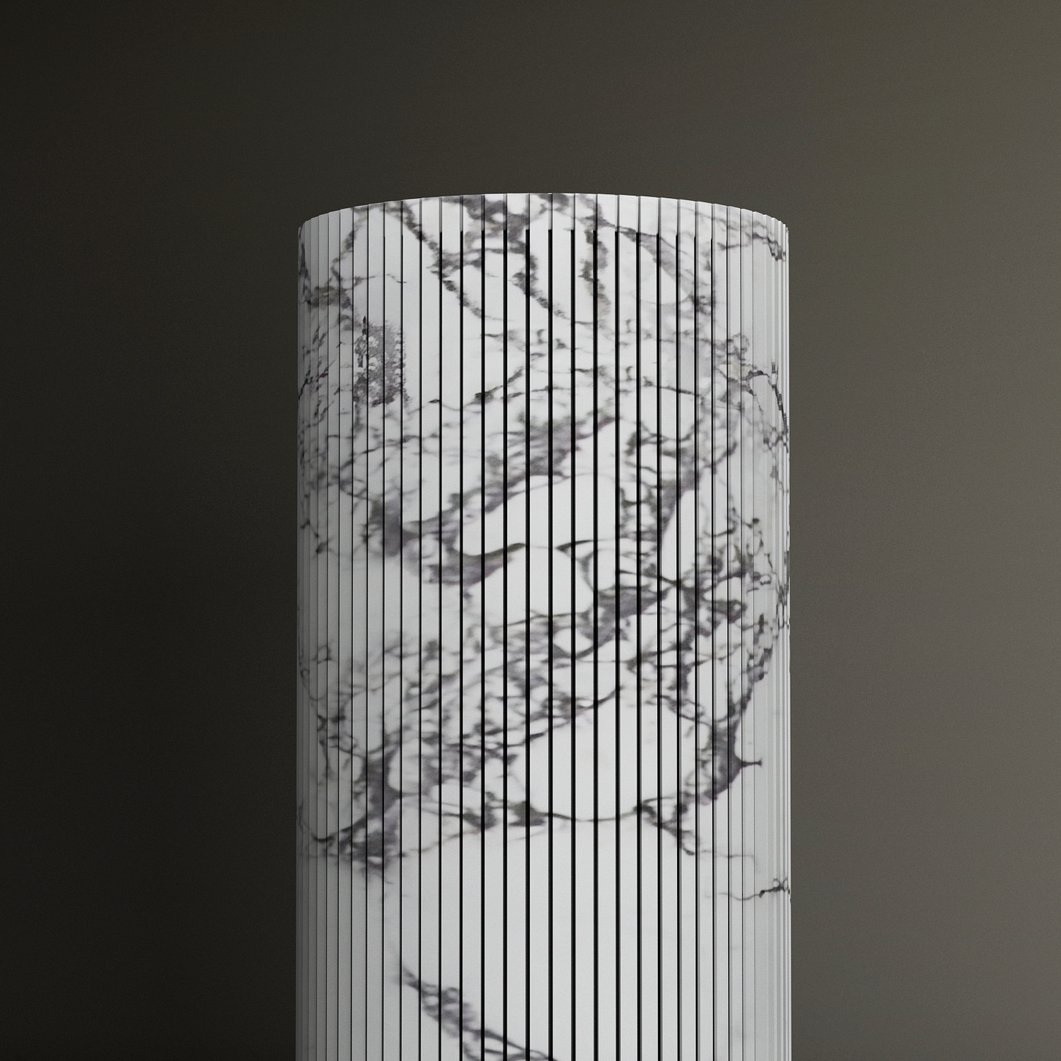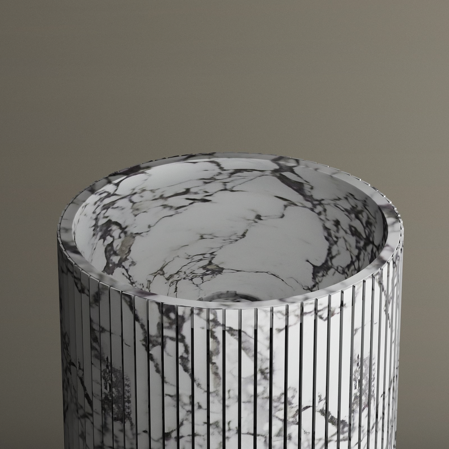 Sculptural fluting carved into Calacatta marble adds depth and drama to this round pedestal. A showcase of craftsmanship, it embodies both modern design and ancient stone tradition.