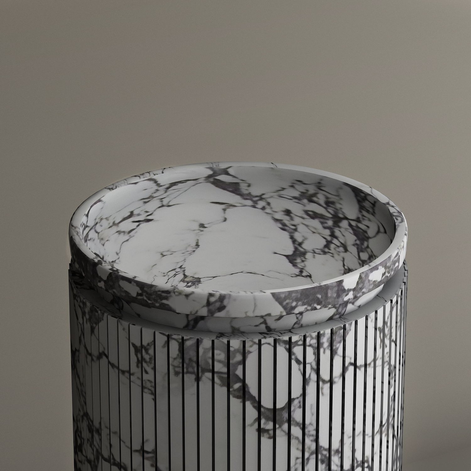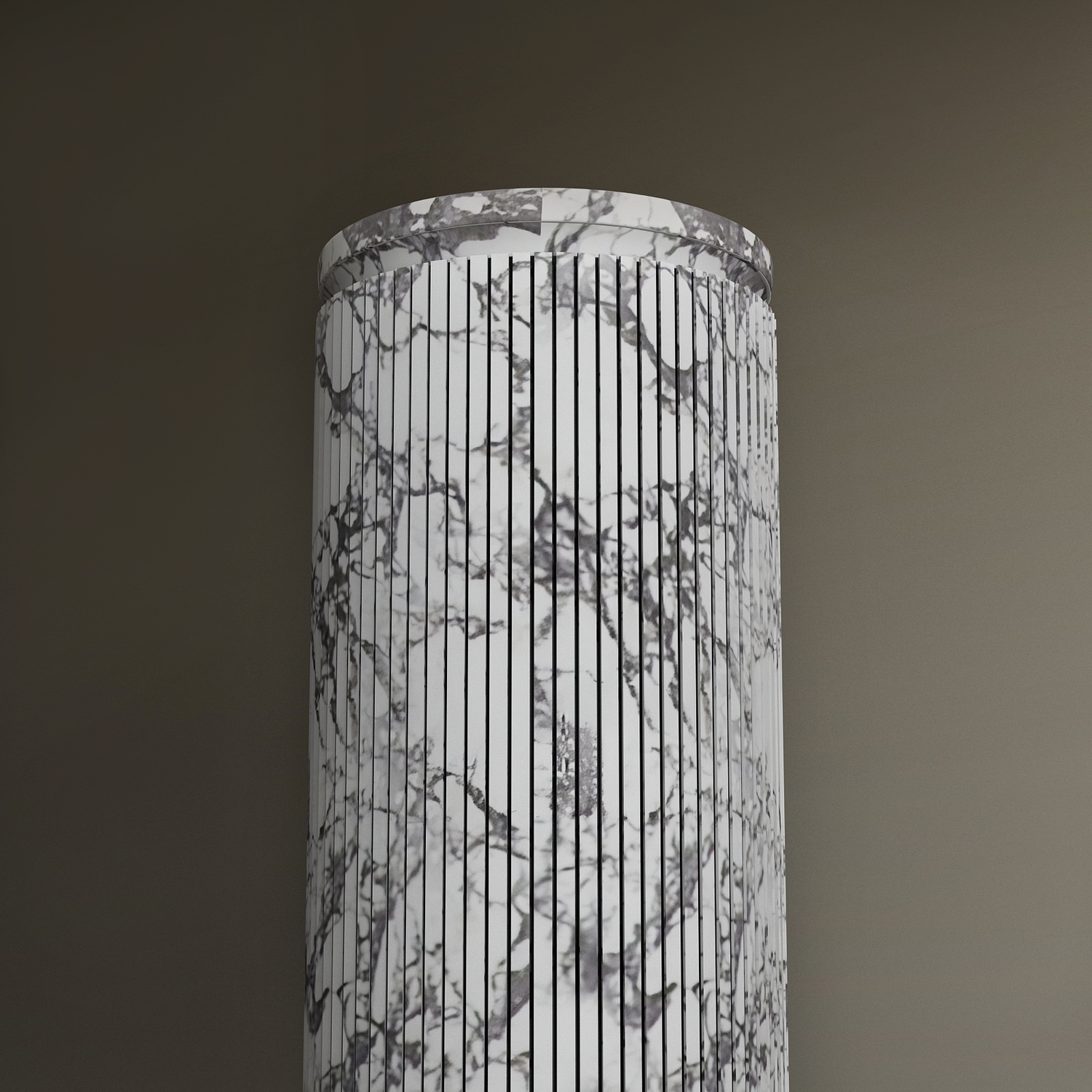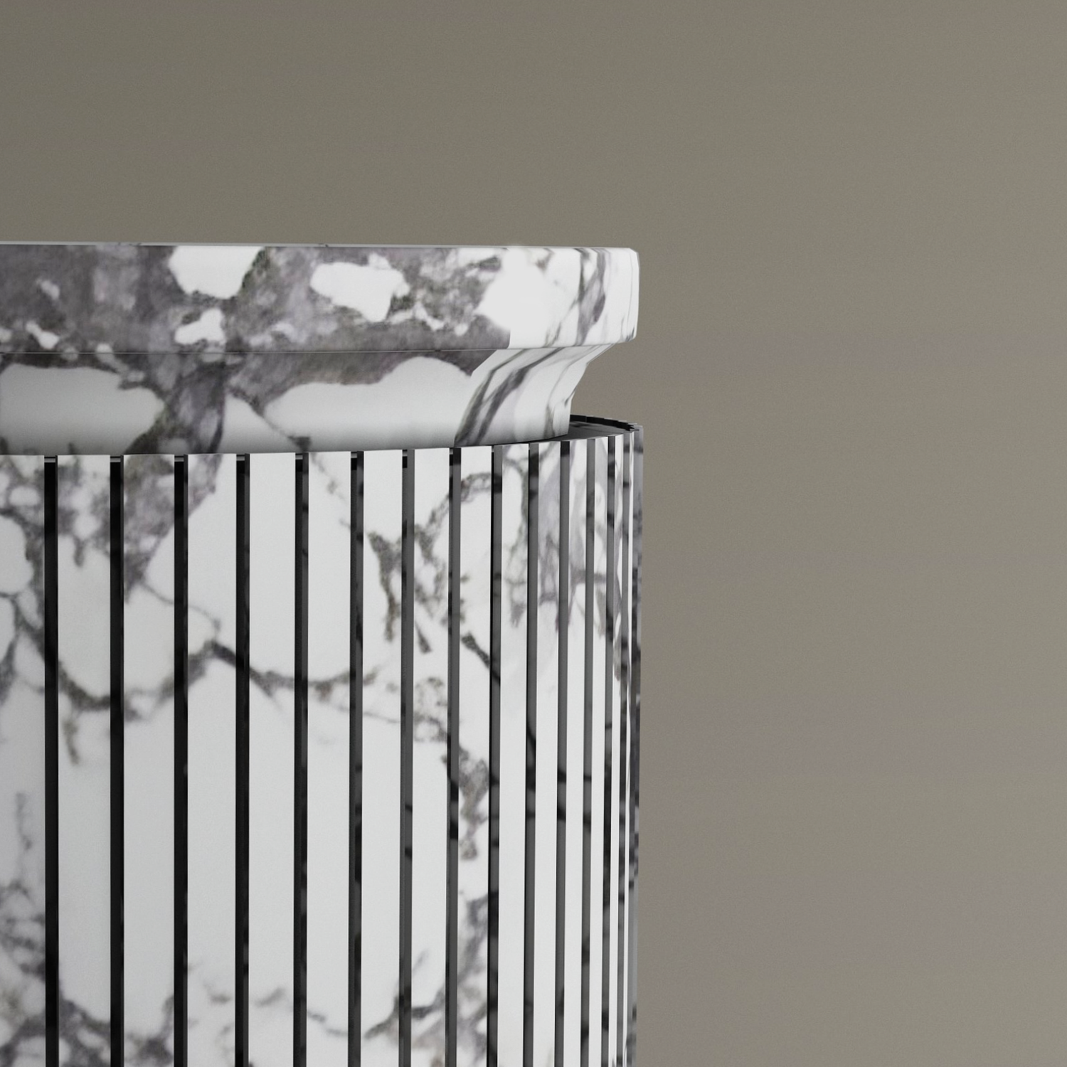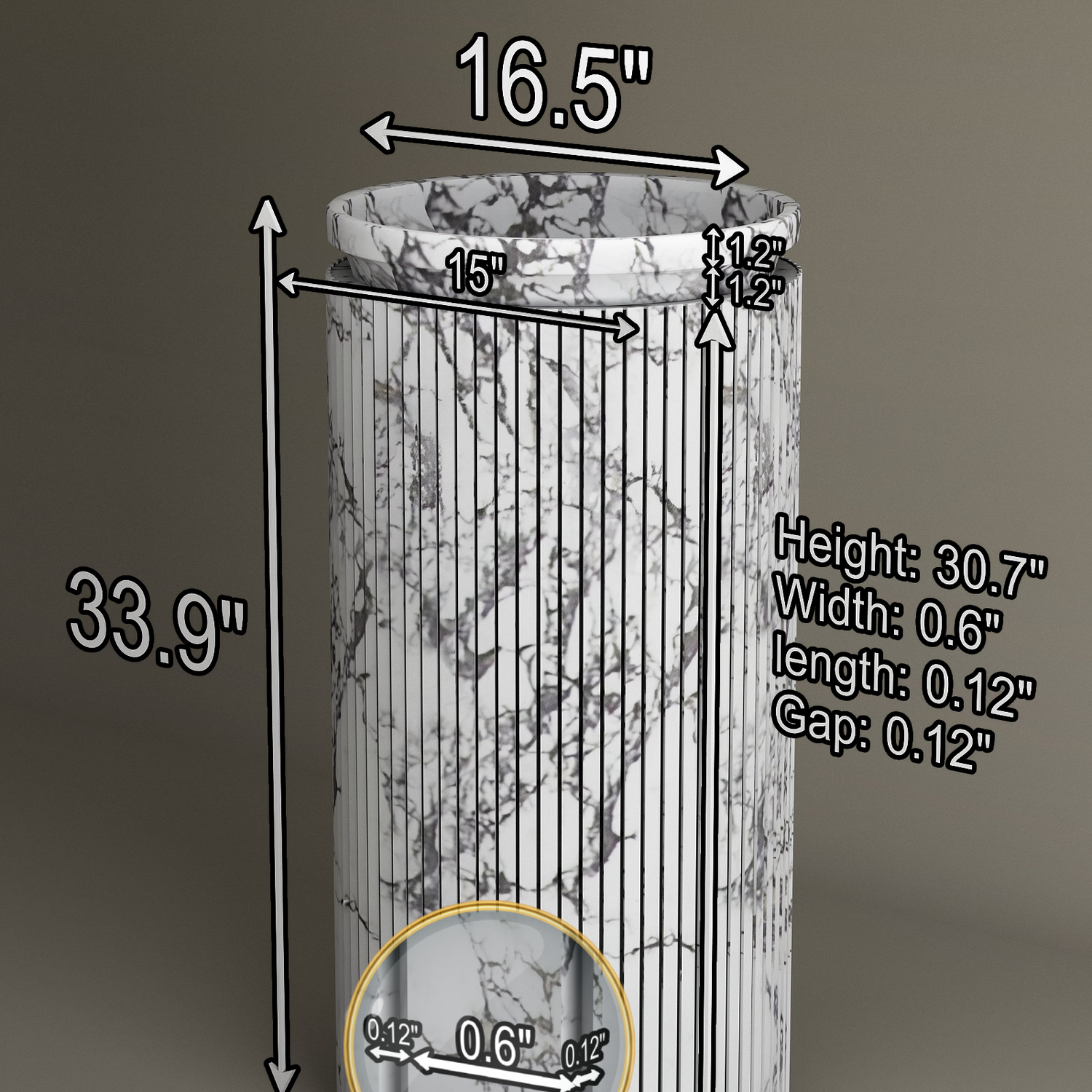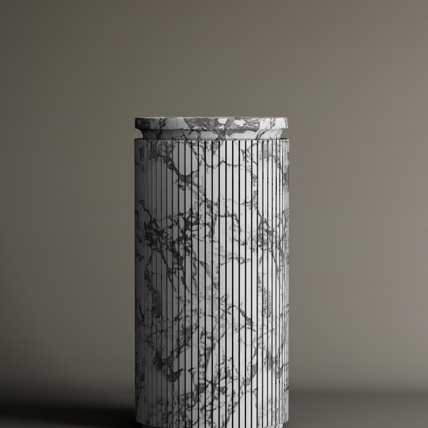 The fluted surface is meticulously carved — each flute is 0.6" (15 mm) wide, separated by a 0.12" (3 mm) gap, while the base sits on a subtle 0.8" (20 mm) lift, creating lightness and shadow play across the stone.