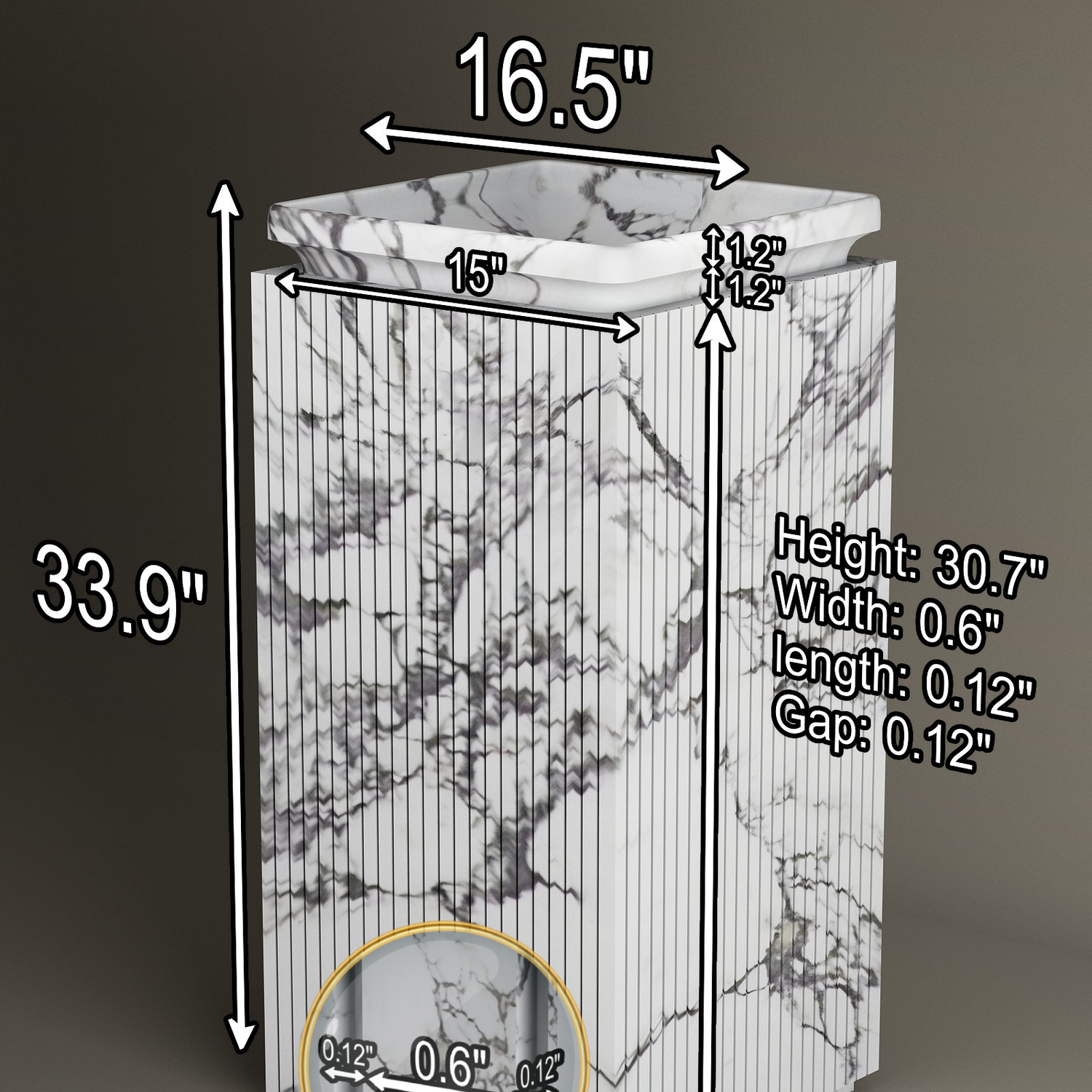 Height 31.5" (800 mm), Width 16.5" (420 mm). Each flute measures 0.6" (15 mm) in width with a 0.12" (3 mm) gap, creating a refined rhythm across the pedestal surface.