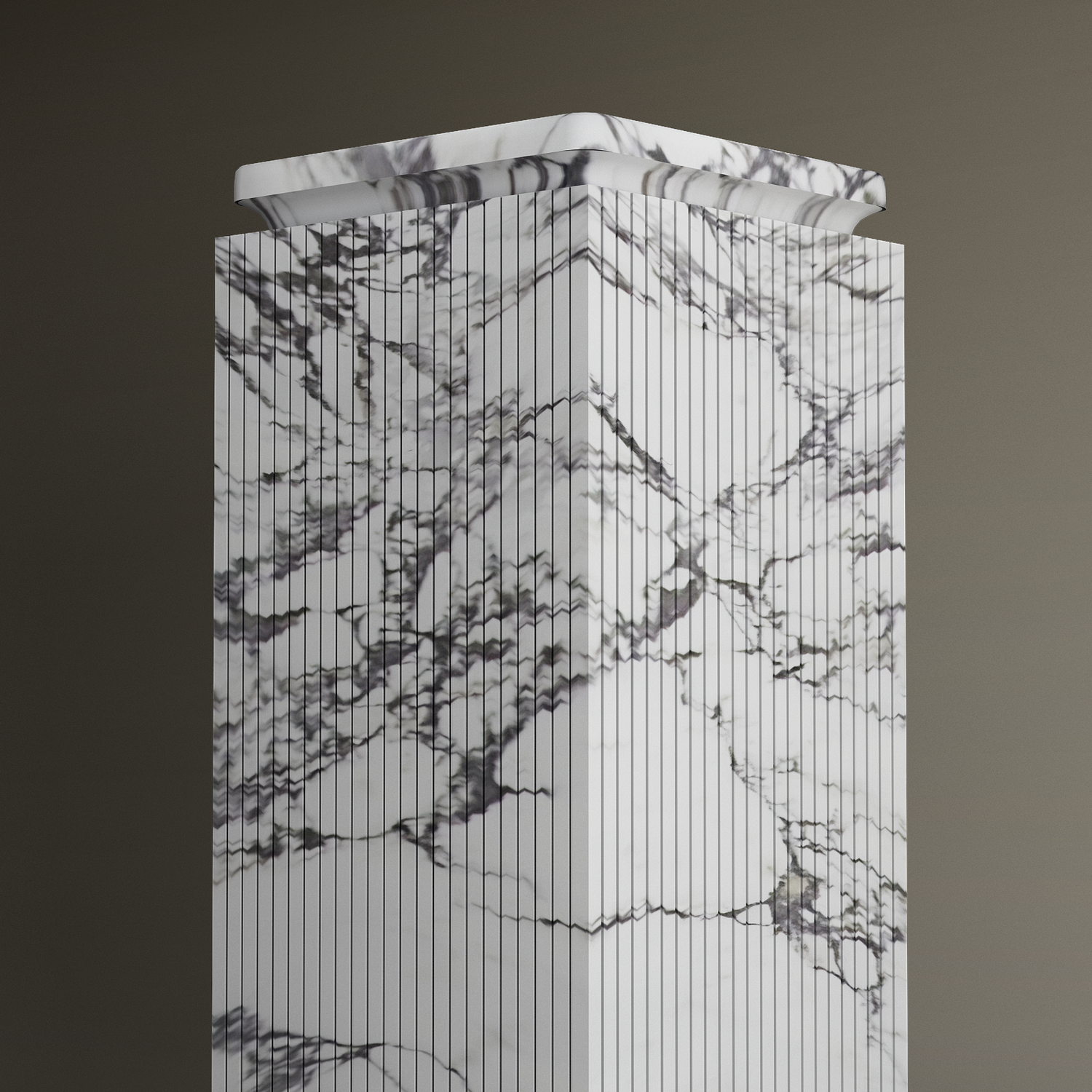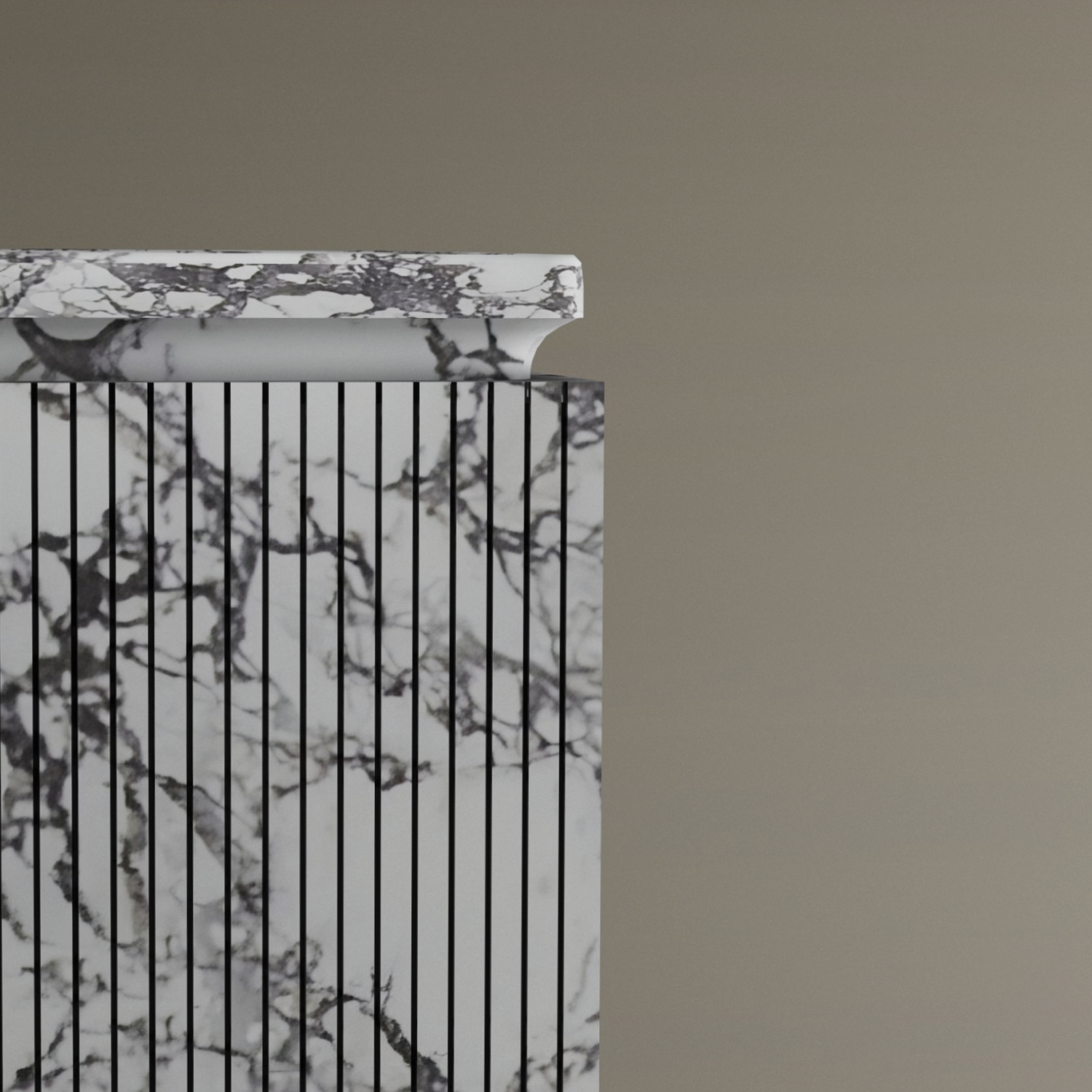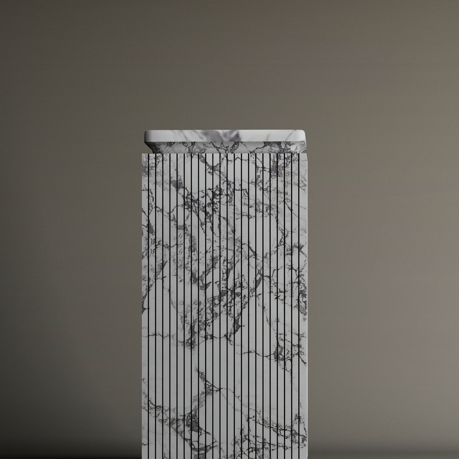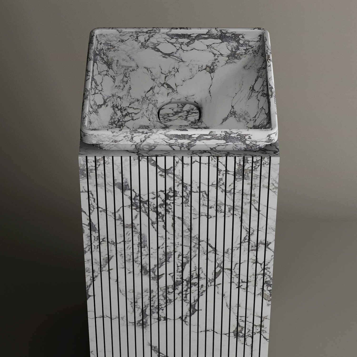 The TRAVERTABLE Calacatta Square Marble Pedestal Vanity Sink features a marble-like surface with dark veins and vertical black grooves, set against a neutral background—ideal for modern bathroom design.