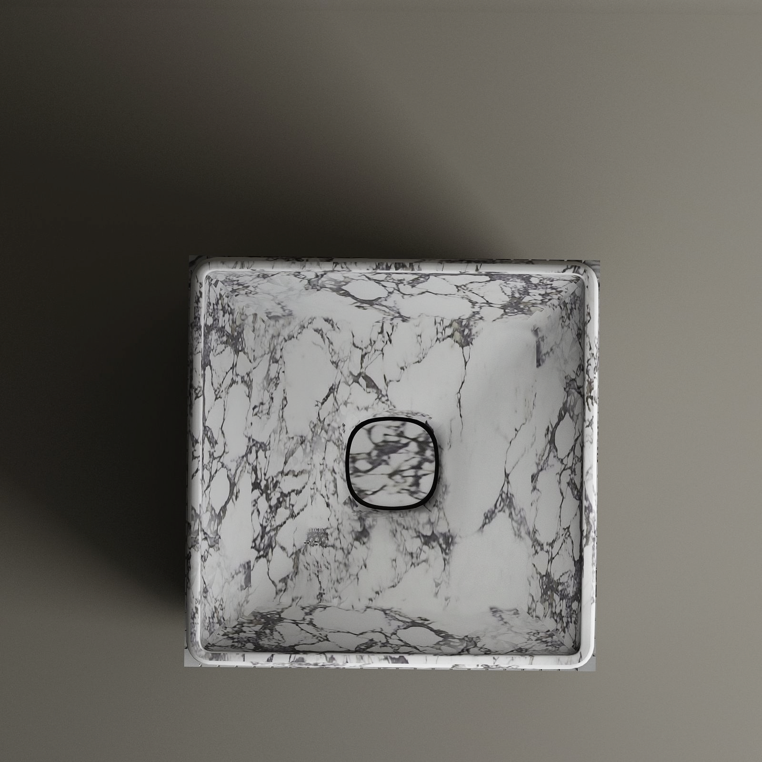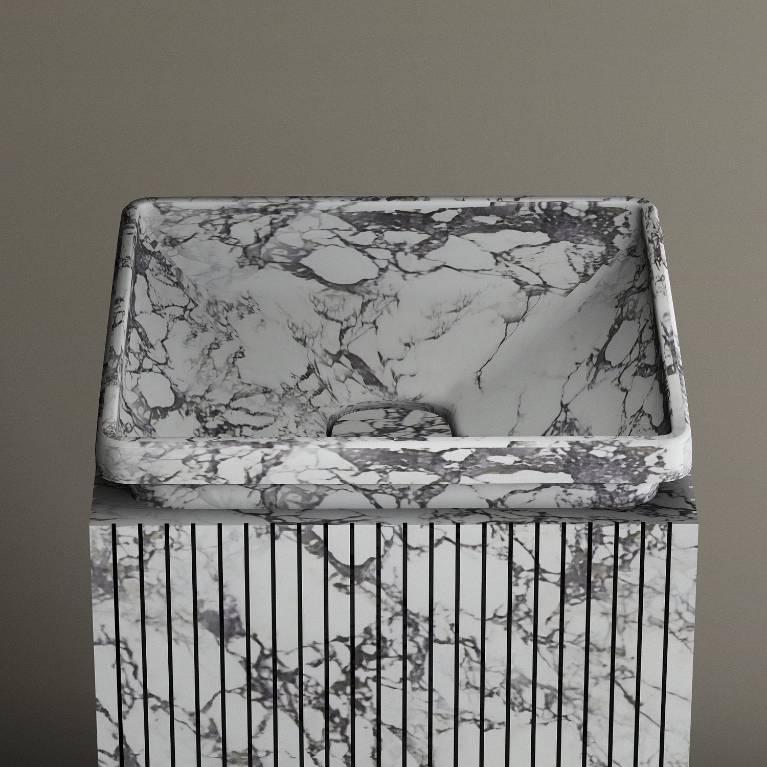 A bold square form in Calacatta marble, blending crisp architectural lines with the stone’s iconic veining. Crafted as a centerpiece, it balances strength and refinement in modern bathroom design.