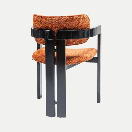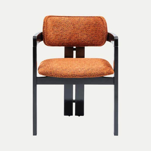 The Travertable Solaris Retro Chair boasts a modern ergonomic design with a round backrest and rectangular armrests. It is upholstered in orange textured fabric, and its sleek black frame enhances its contemporary, distinctive style.