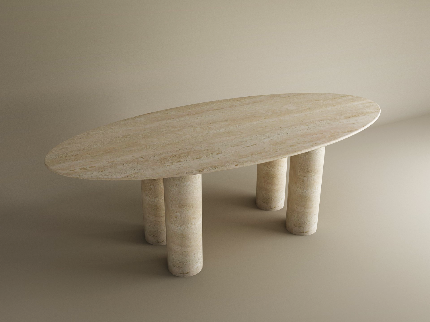 Bring a sense of calm and longevity and heirloom quality to your home with this ellips travertine dining table, paired with a cylindrical base. The natural stone tabletop is a testament to timeless design, with its gentle veining and warm tones that invite gathering and connection.