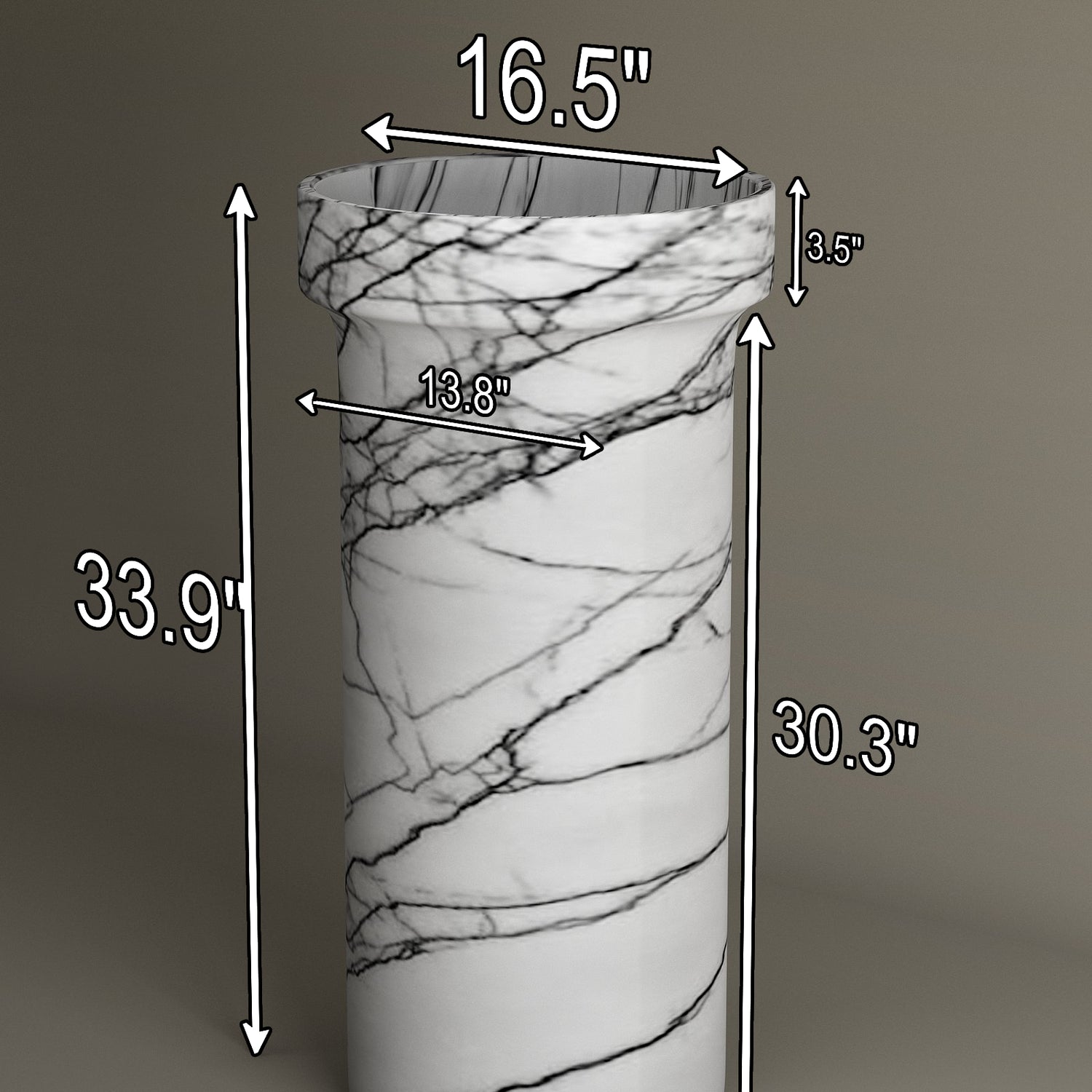 This vanity stands at 33.9" (860 mm) in height, with a 16.5" (420 mm) diameter at the rim. The inner basin measures 13.8" (350 mm), while the carved rim rises 3.5" (90 mm) above the basin for added depth and presence. The basin itself sits at a practical 30.3" (770 mm) from the floor, offering comfortable everyday use.