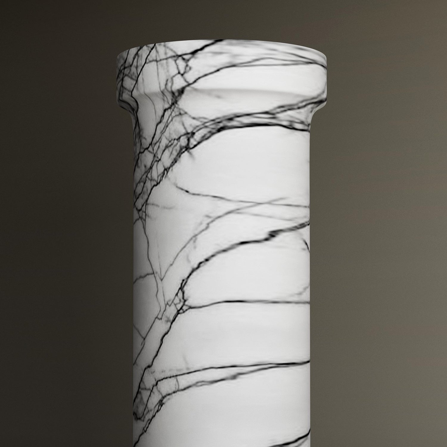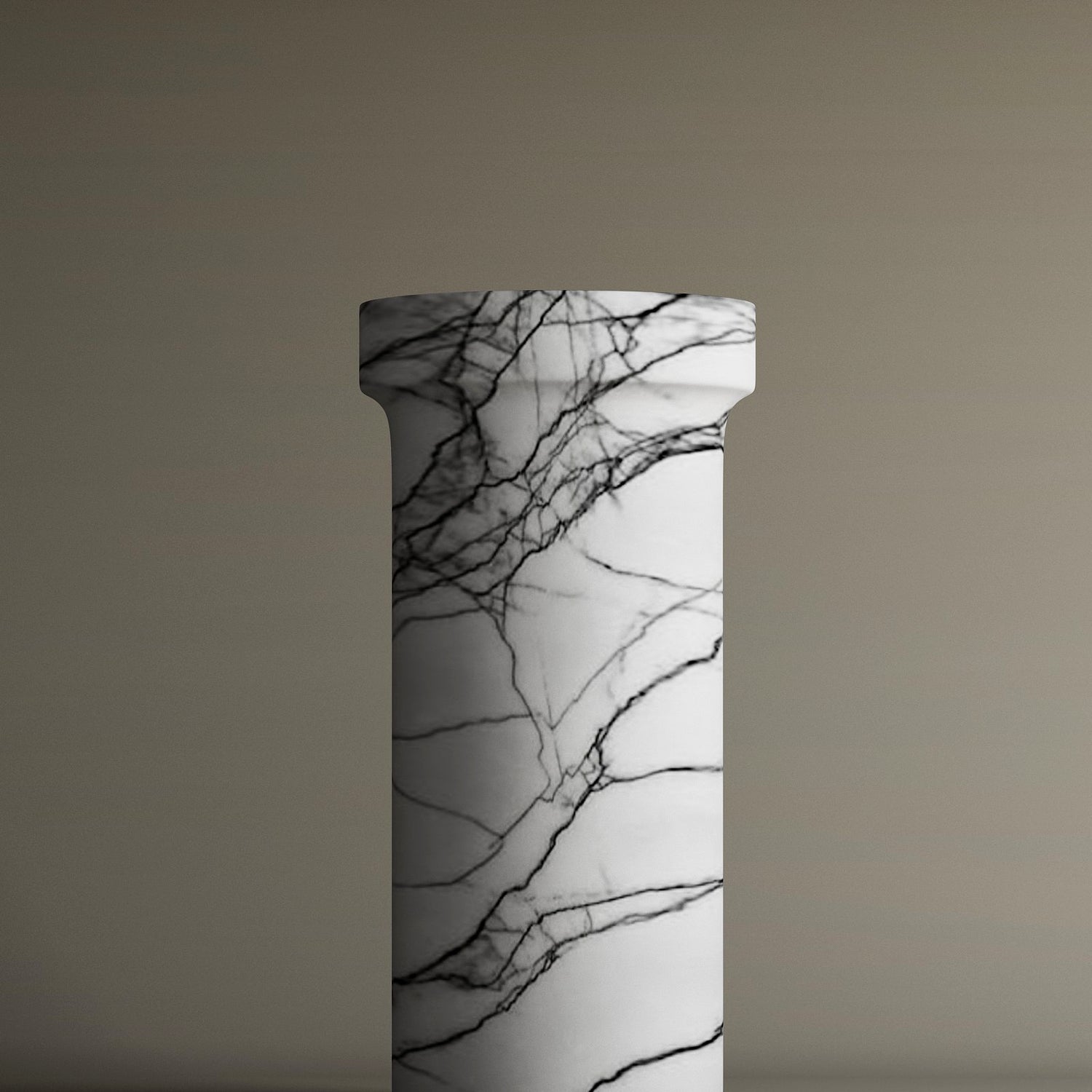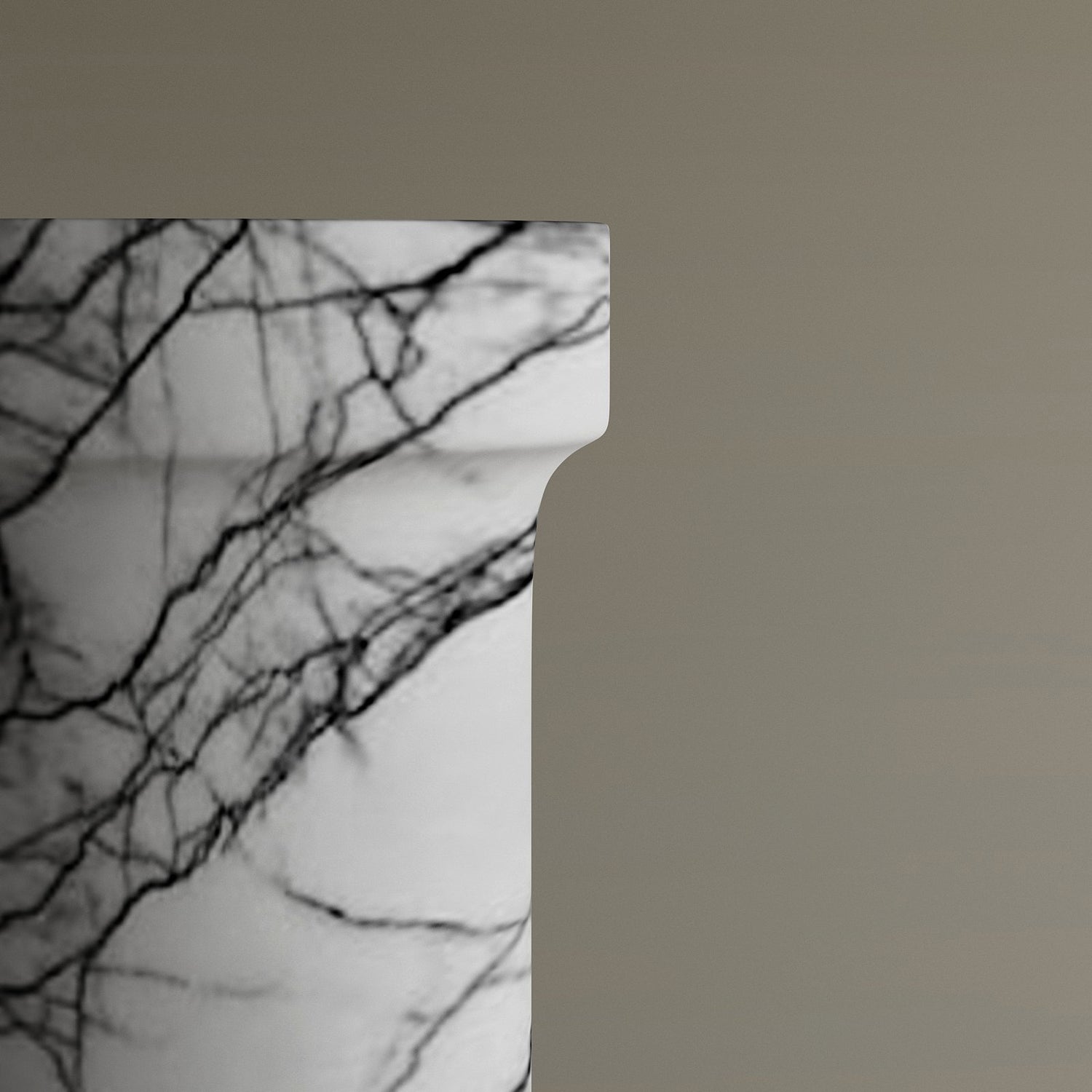The Lilac Marble Pedestal Vanity Sink by TRAVERTABLE features striking black veining on a tall, freestanding white marble column with a simple capital, set against a neutral background.