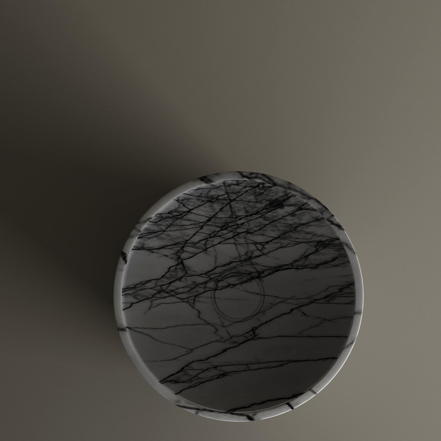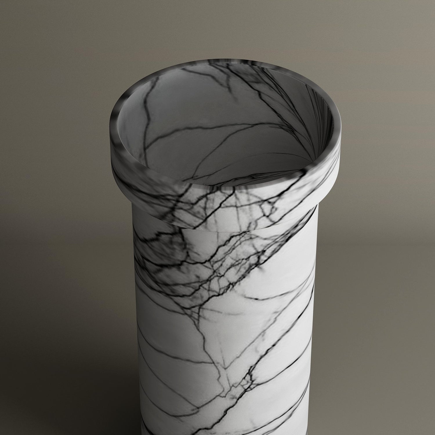 The cylindrical body provides a strong architectural form, softened by the natural veining of Calacatta Viola marble.