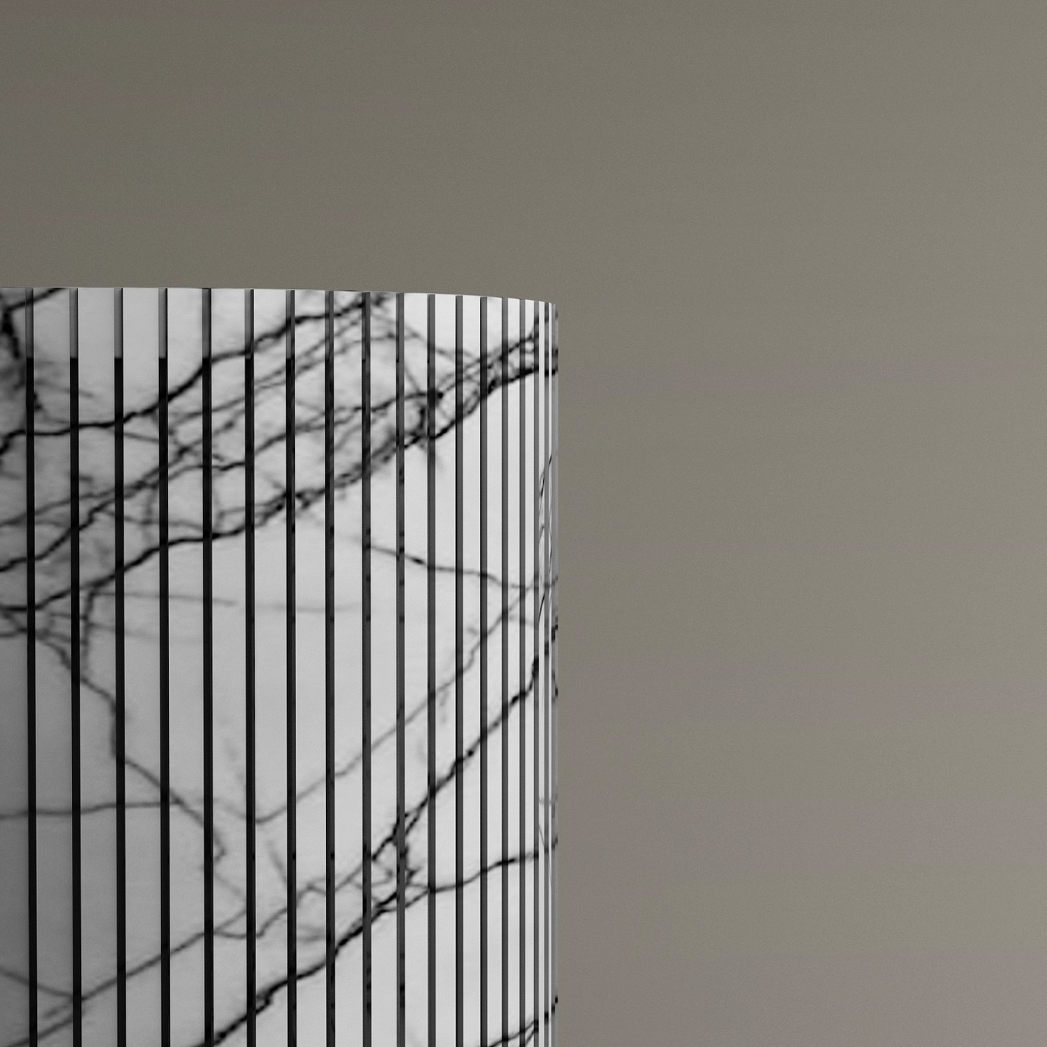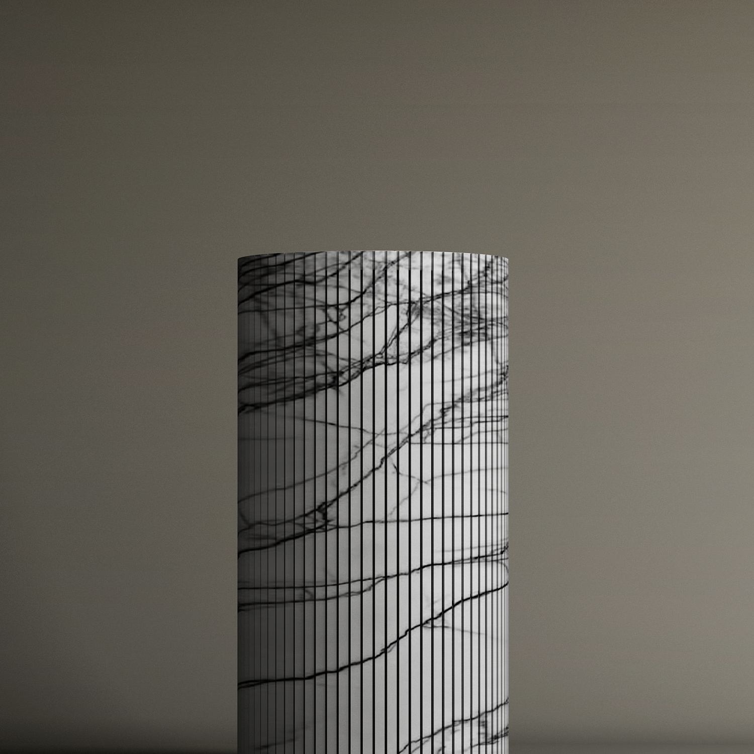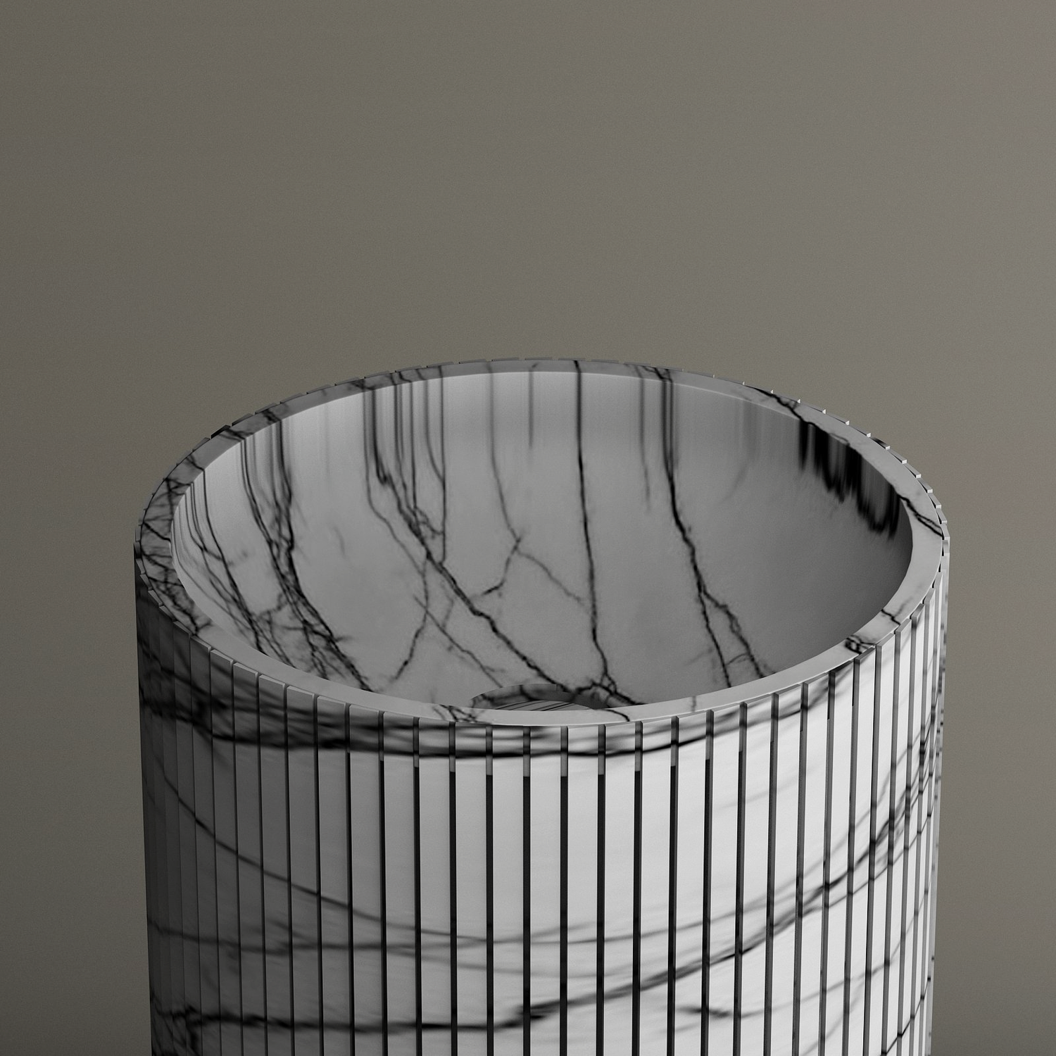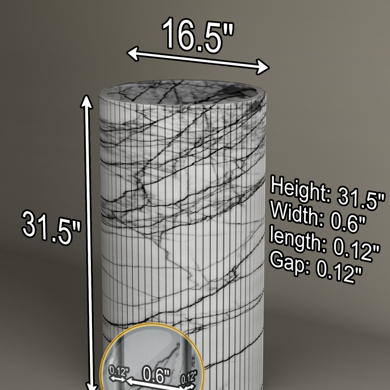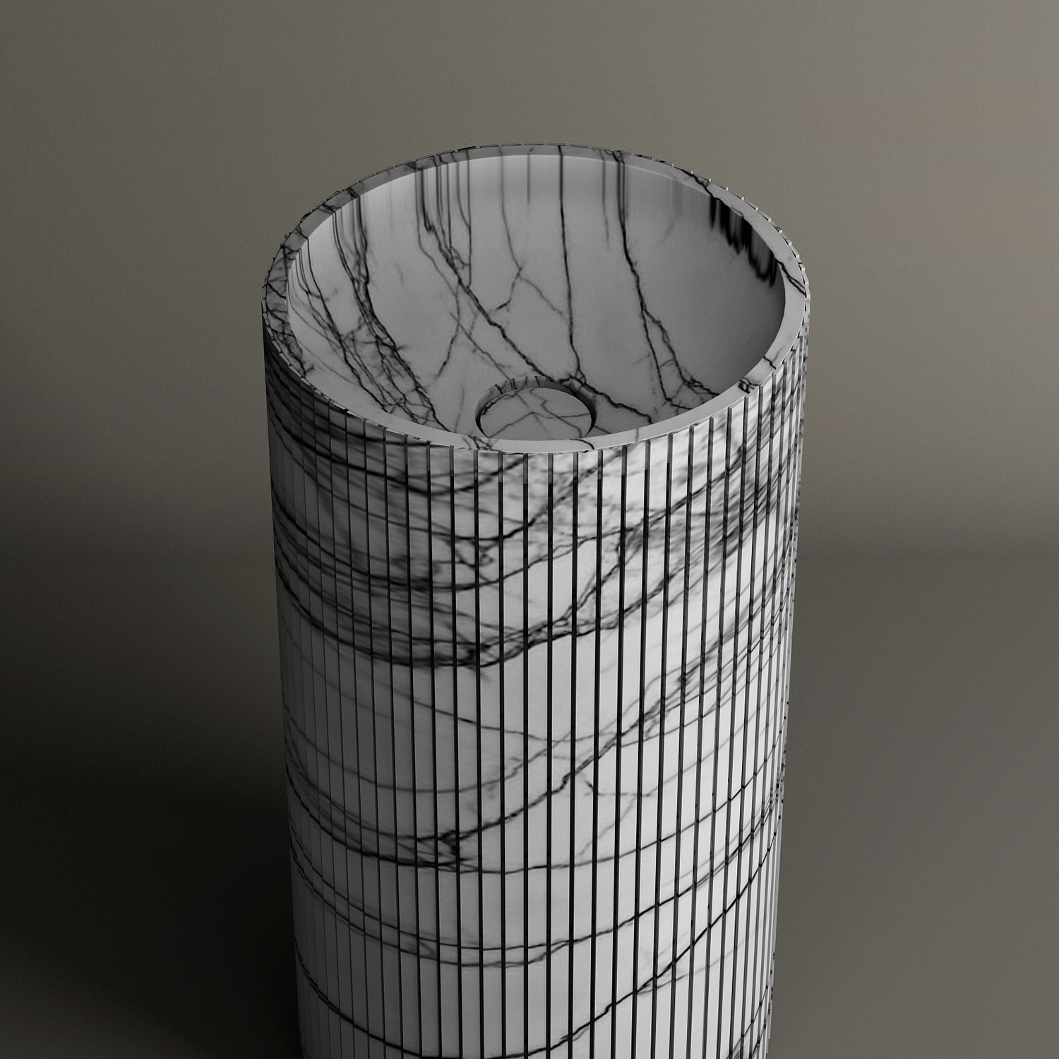 This pedestal vanity stands at 31.5" (800 mm) in height, with a 16.5" (420 mm) diameter that offers a balanced footprint for both compact and spacious bathrooms. Each fluted detail is carved with precision — 0.6" (15 mm) in width and 0.12" (3 mm) in depth, separated by a 0.12" (3 mm) gap, creating rhythmic shadows that enhance the natural veining of the marble.