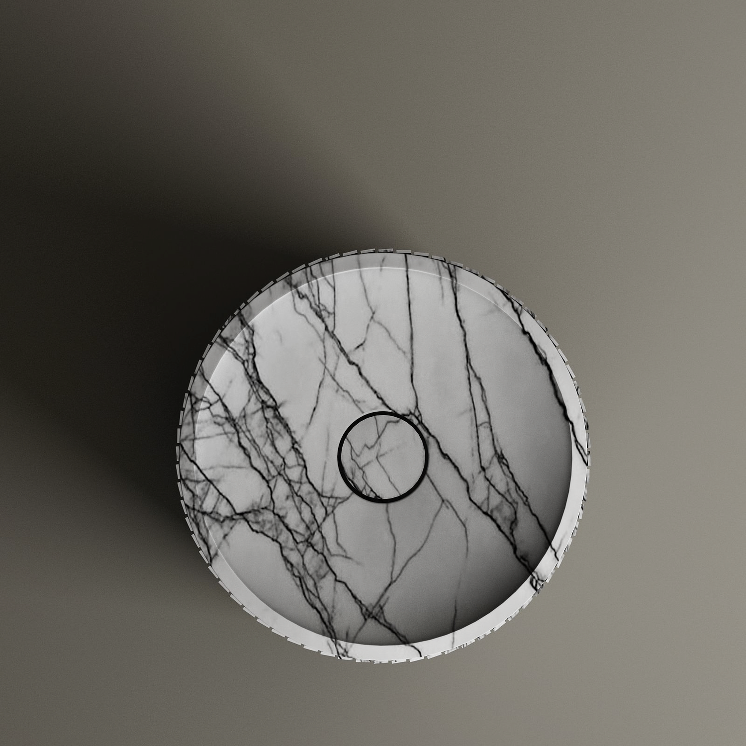 Bold lilac marble enhanced by sculptural fluting, creating a round pedestal basin that feels like living art. Both refined and daring, it redefines the bathroom as a gallery space.