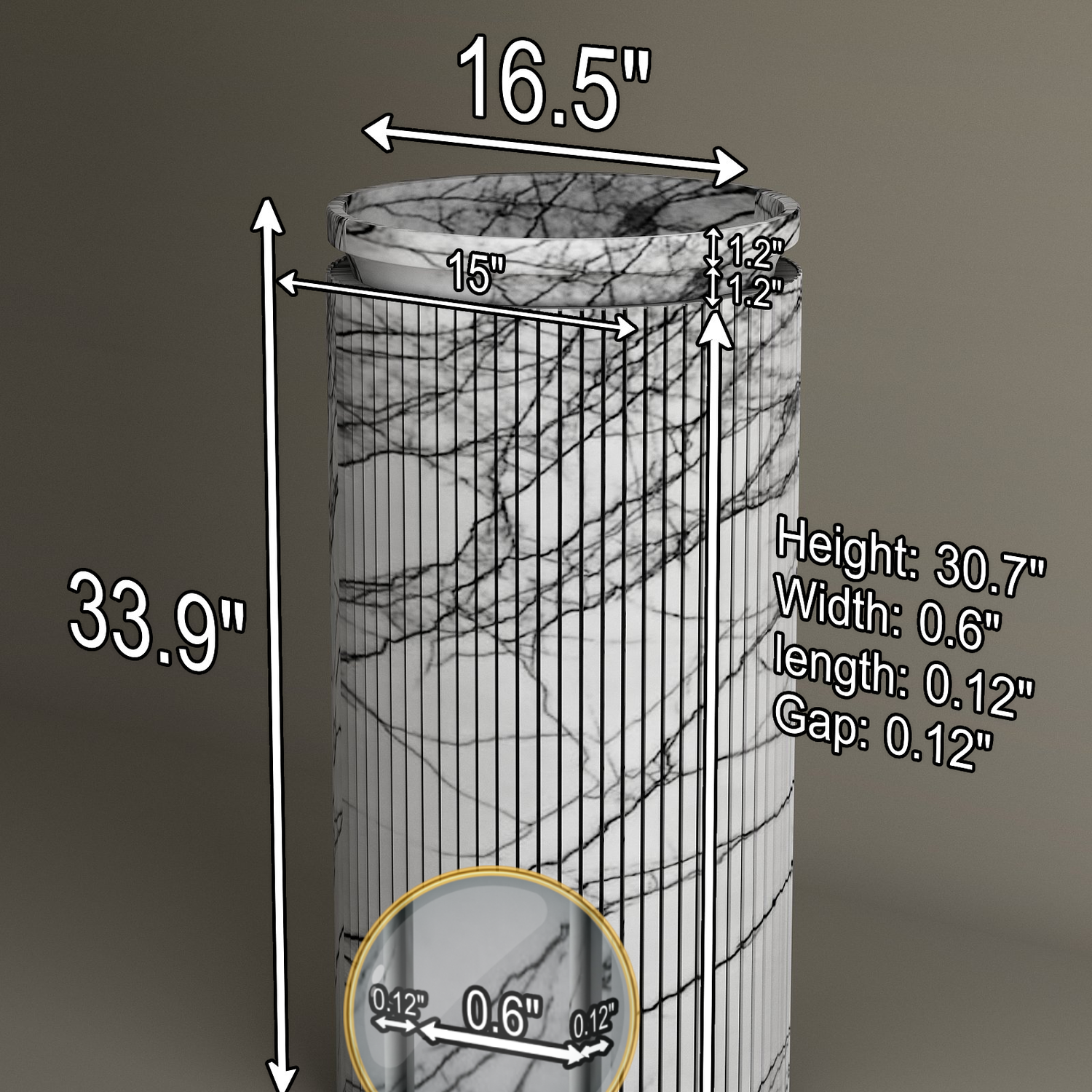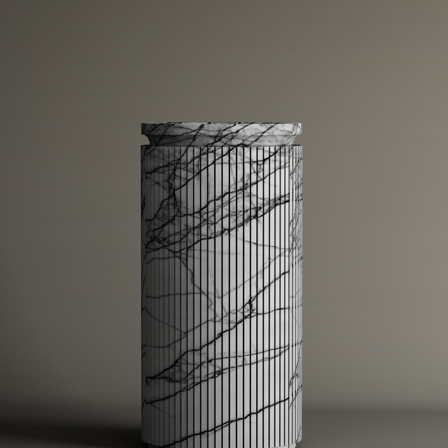 The fluted surface is meticulously carved — each flute is 0.6" (15 mm) wide, separated by a 0.12" (3 mm) gap, while the base sits on a subtle 0.8" (20 mm) lift, creating lightness and shadow play across the stone.