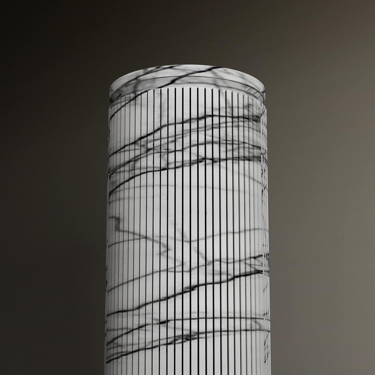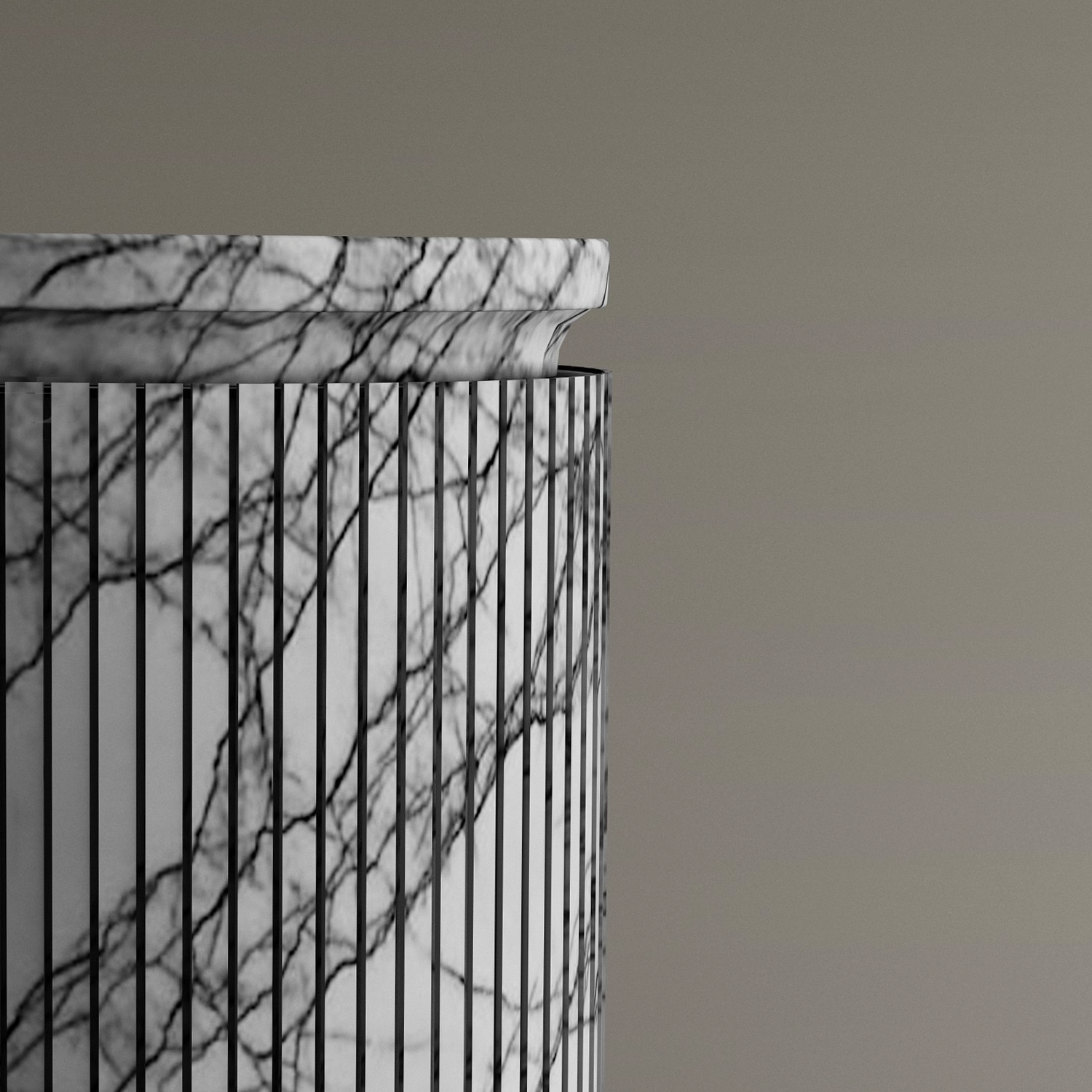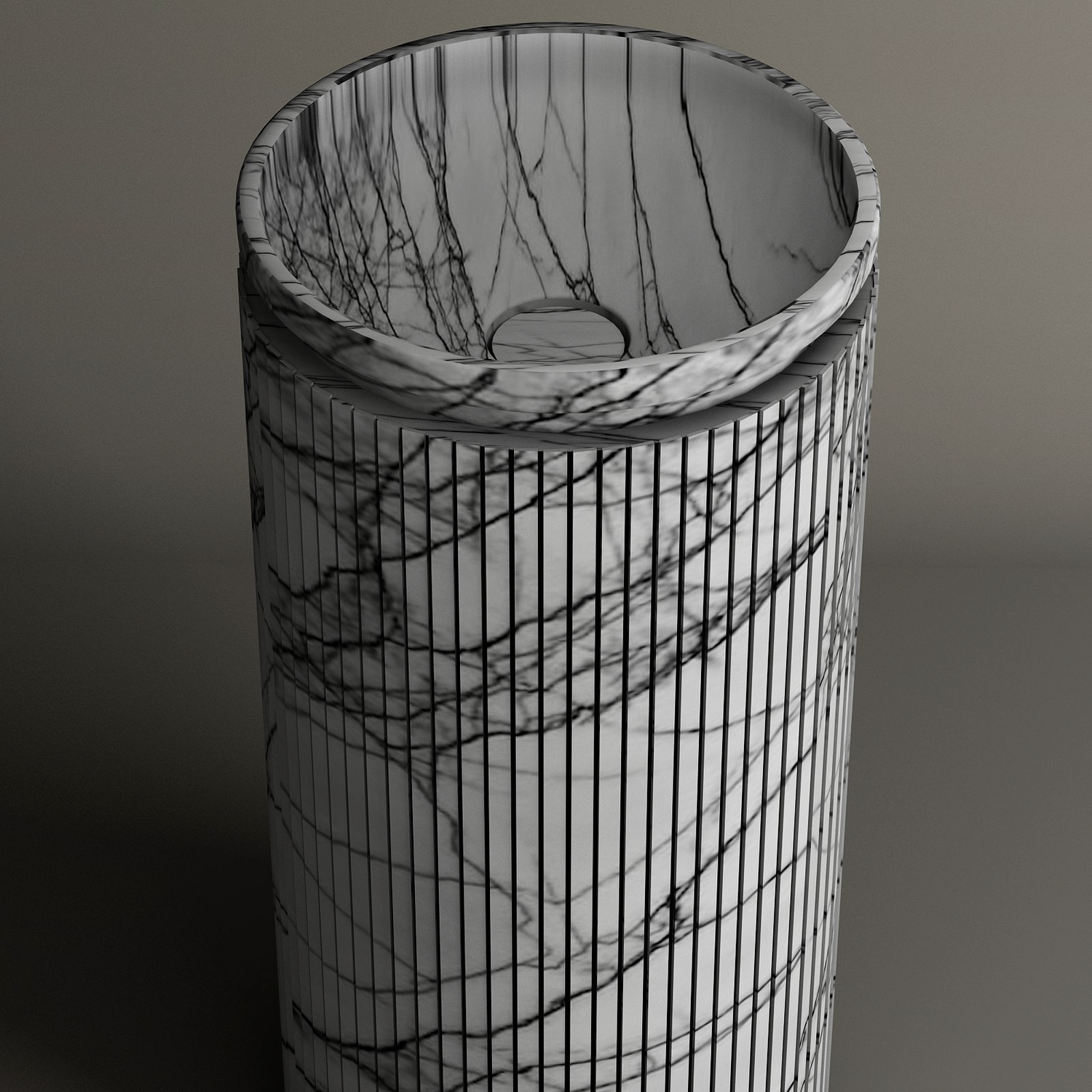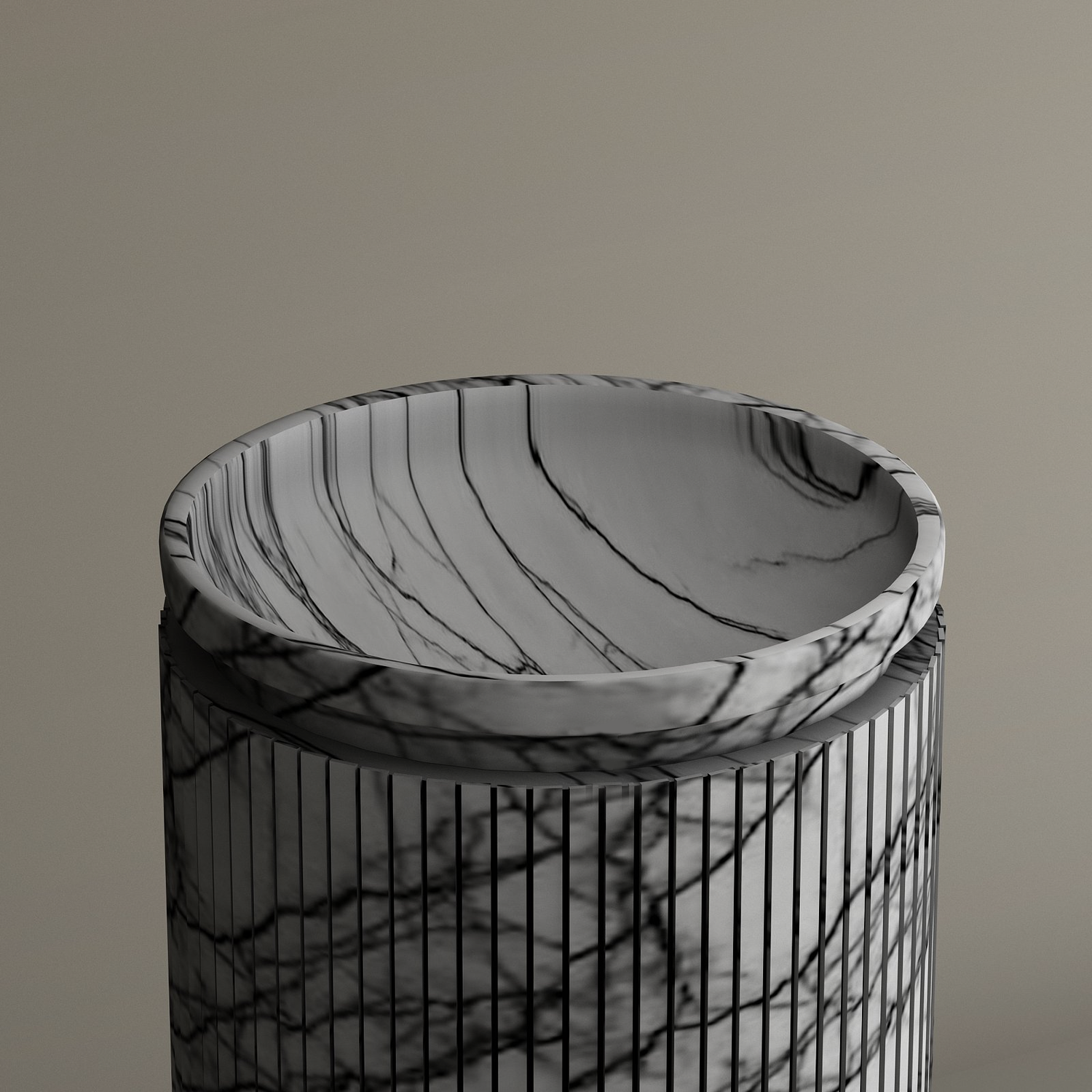 The TRAVERTABLE Lilac Round Marble Pedestal Vanity Sink features a cylindrical design with black veins and vertical lines, topped by a shallow circular dish. Set against a neutral beige background, it highlights sculptural elegance for your bathroom.