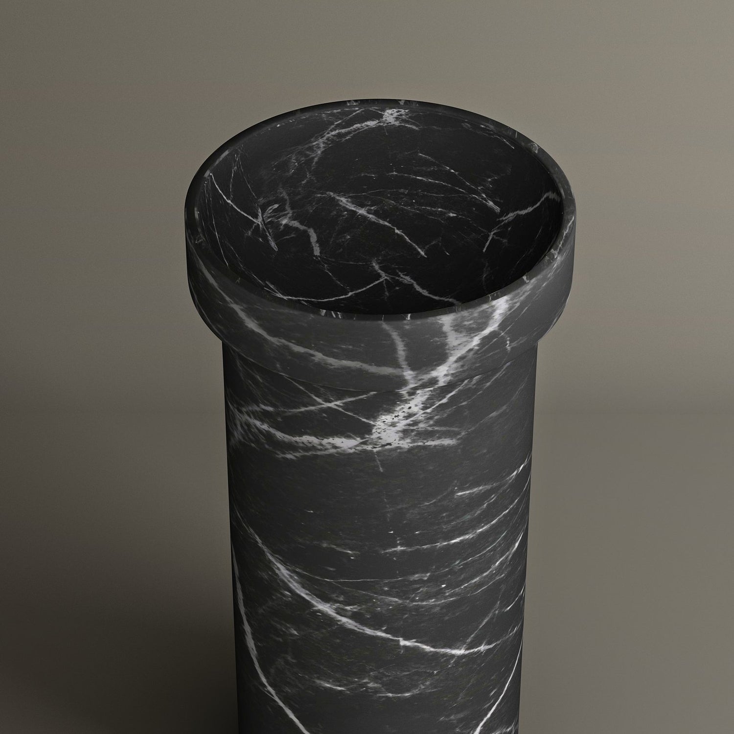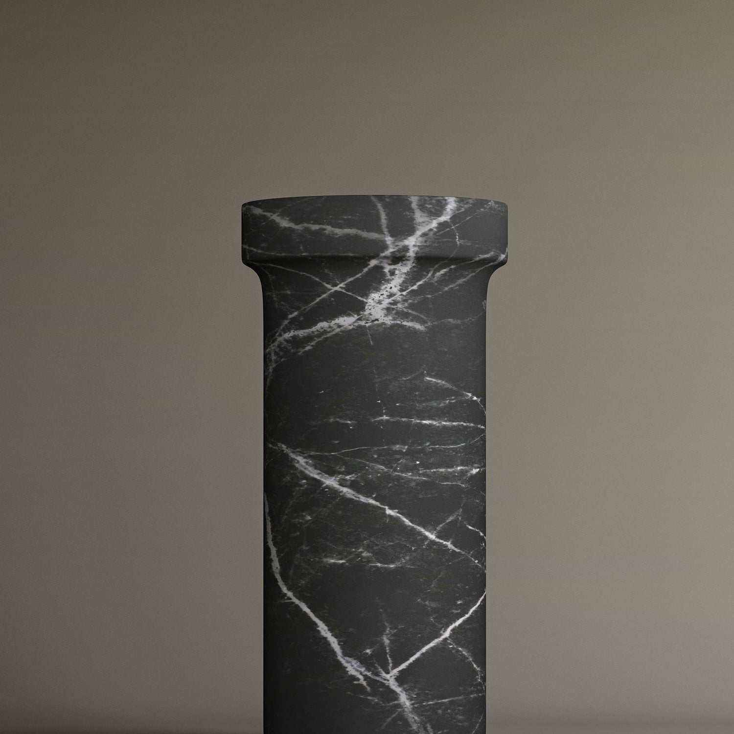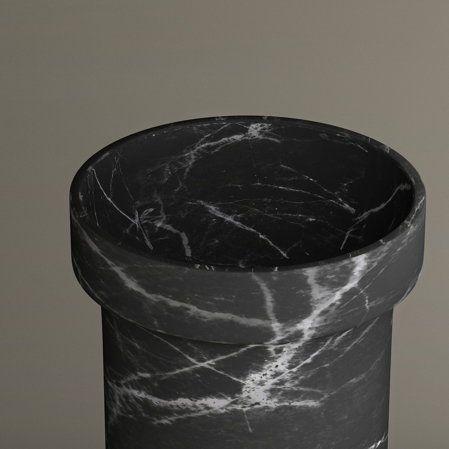 Deep Nero Marquina marble cut into a freestanding pedestal. With bold veining and solid presence, it grounds modern interiors with the quiet strength of natural stone.