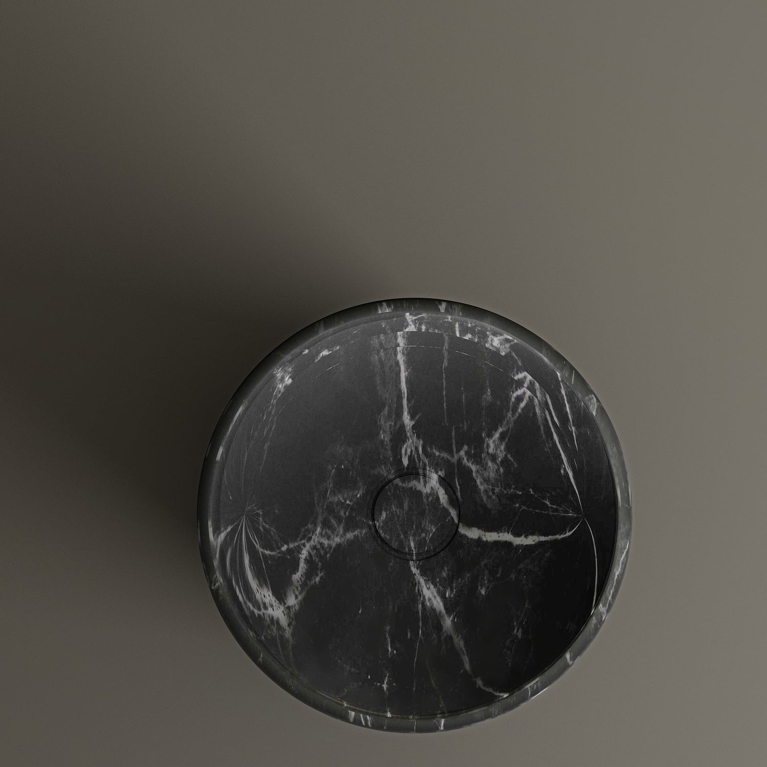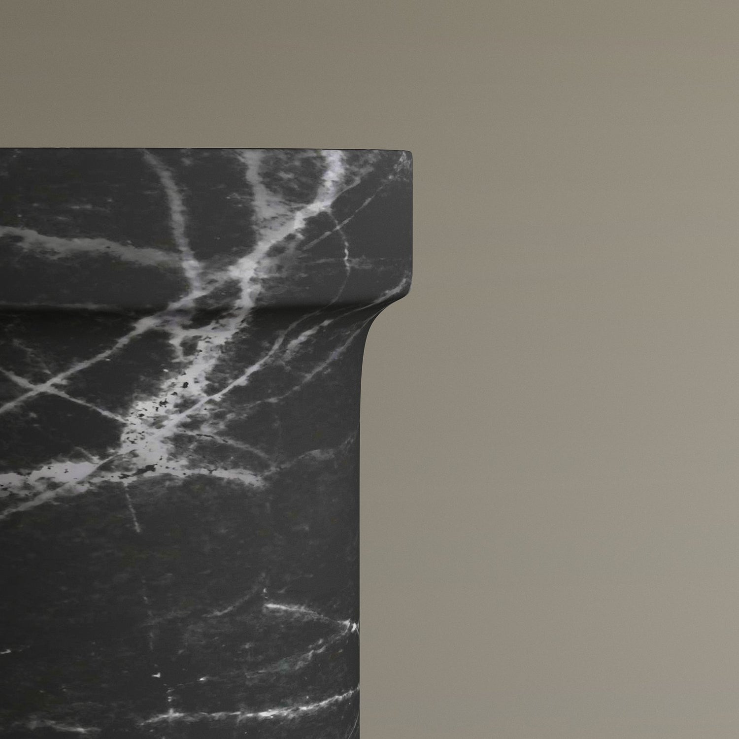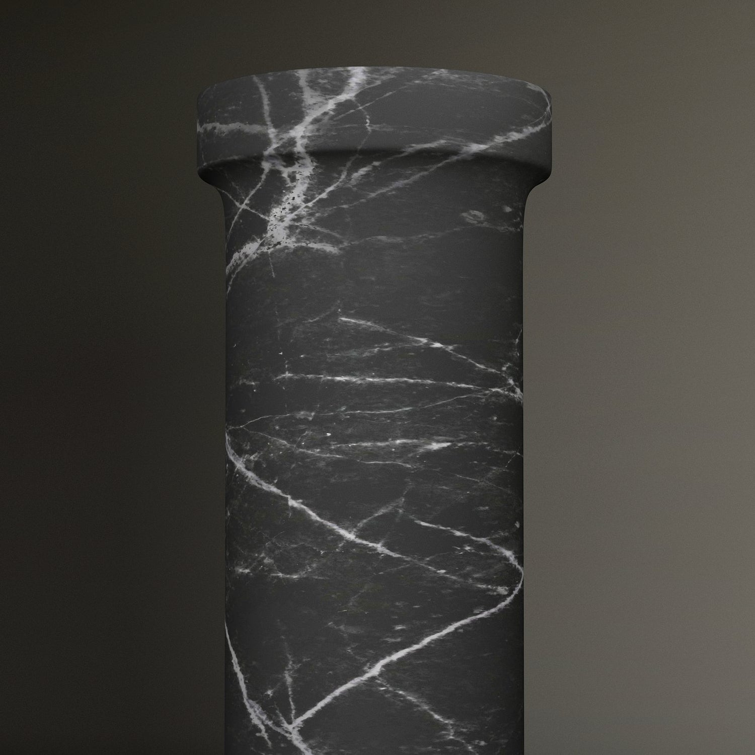Deep Nero Marquina marble cut into a freestanding pedestal. With bold veining and solid presence, it grounds modern interiors with the quiet strength of natural stone.