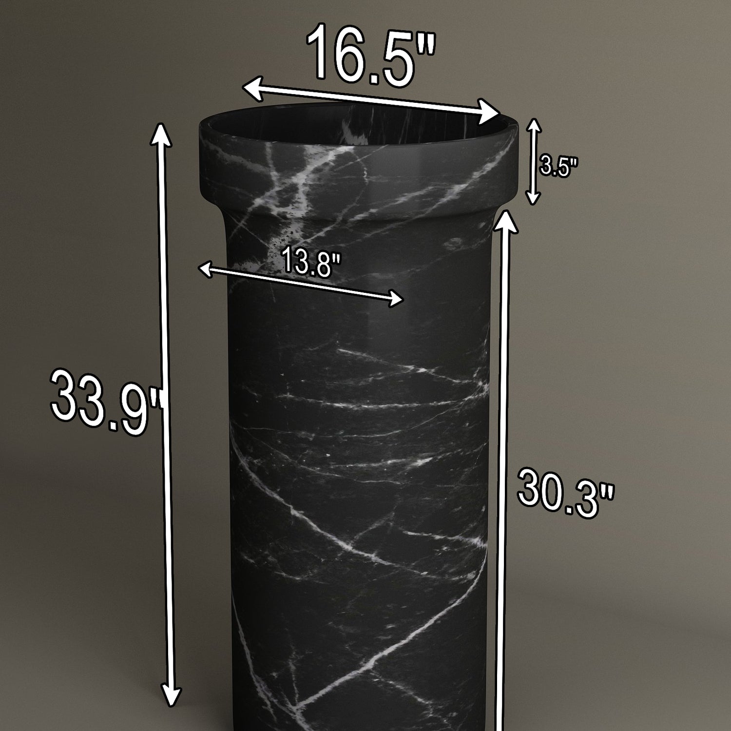 This vanity stands at 33.9" (860 mm) in height, with a 16.5" (420 mm) diameter at the rim. The inner basin measures 13.8" (350 mm), while the carved rim rises 3.5" (90 mm) above the basin for added depth and presence. The basin itself sits at a practical 30.3" (770 mm) from the floor, offering comfortable everyday use.