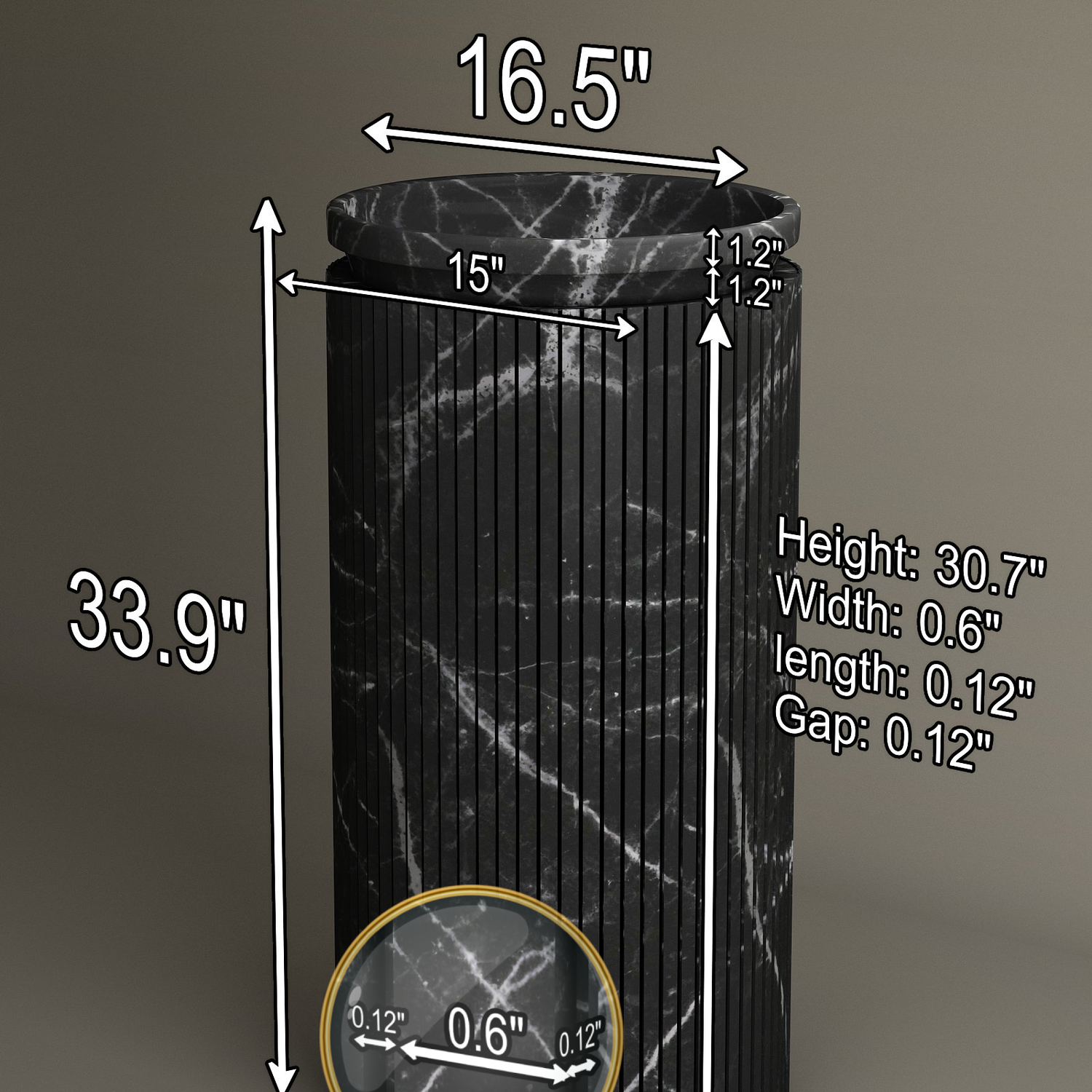 The fluted surface is meticulously carved — each flute is 0.6" (15 mm) wide, separated by a 0.12" (3 mm) gap, while the base sits on a subtle 0.8" (20 mm) lift, creating lightness and shadow play across the stone.