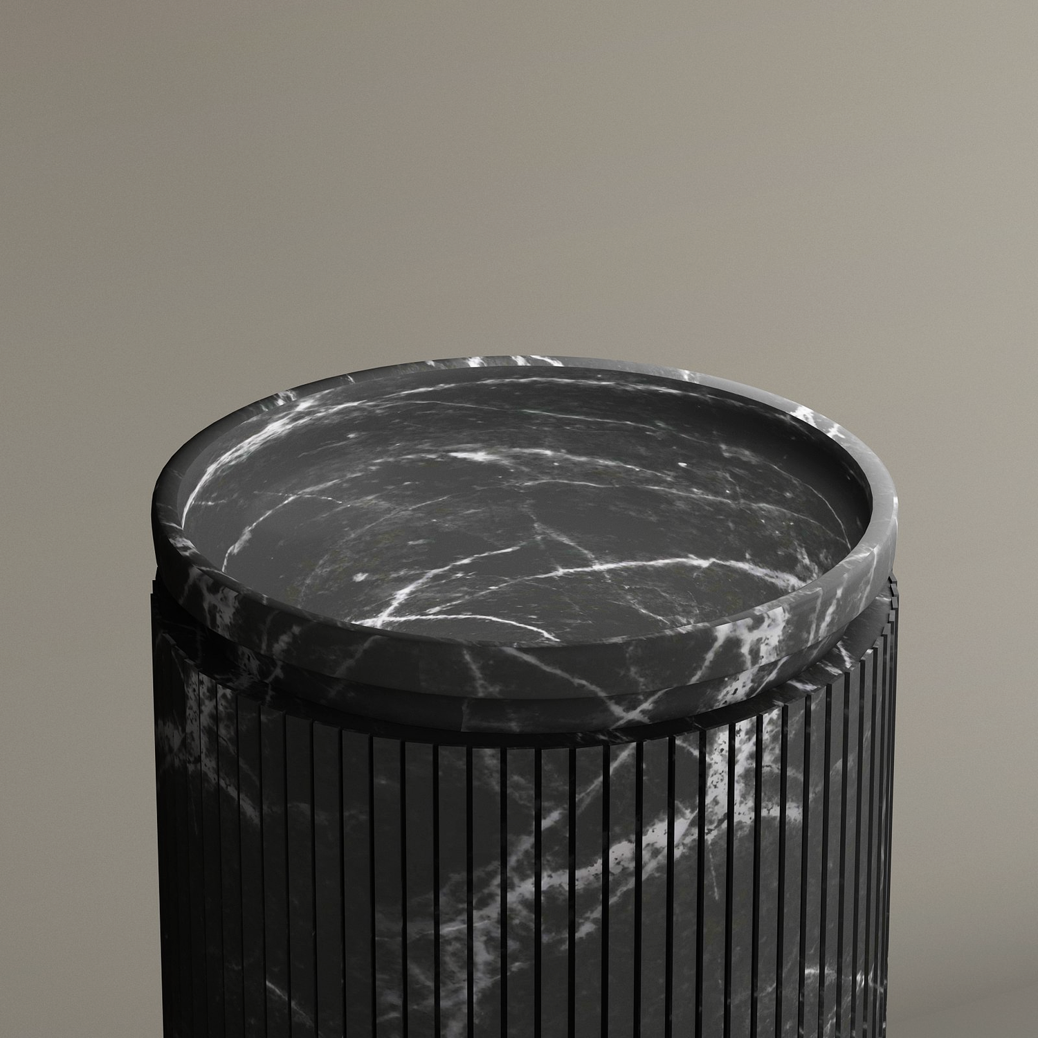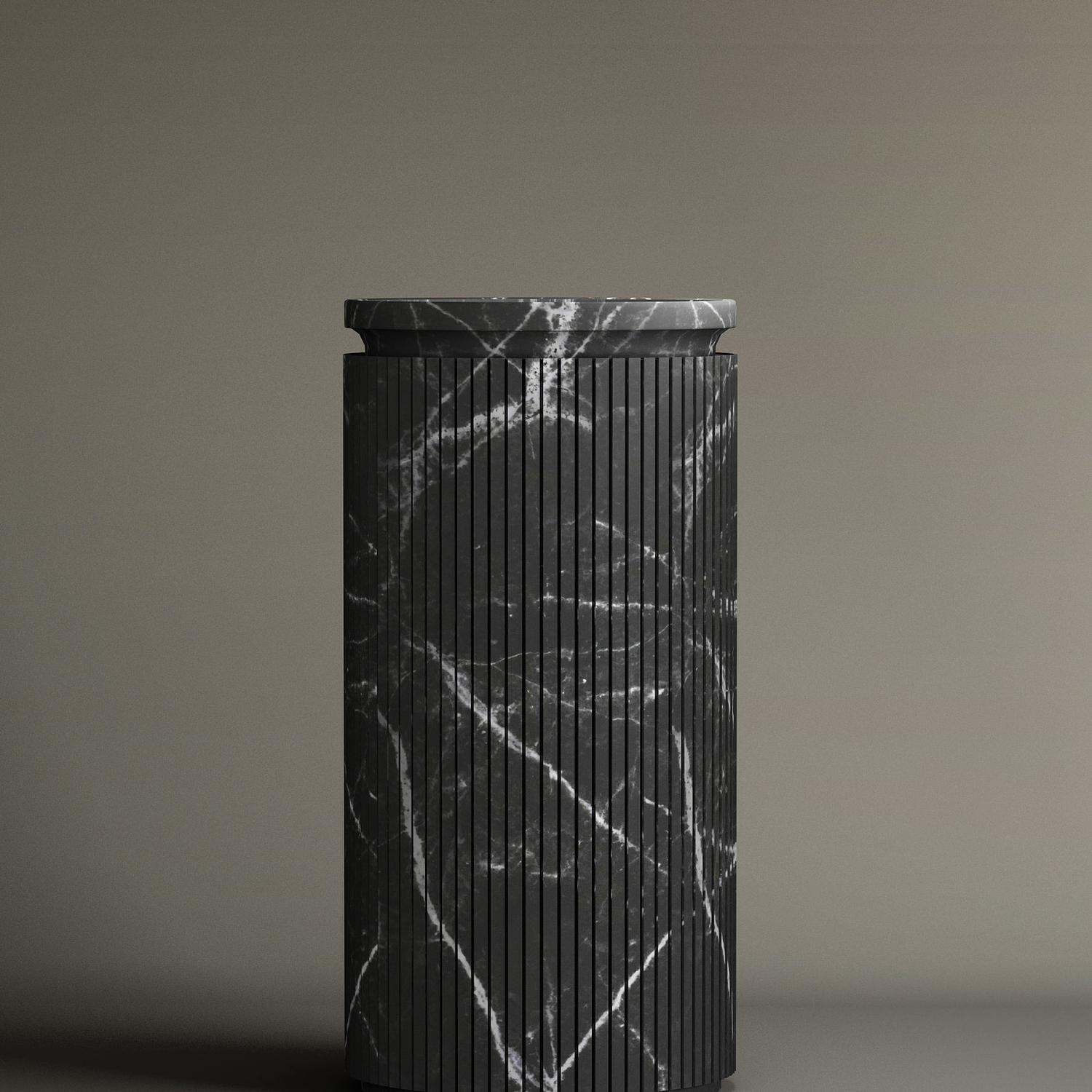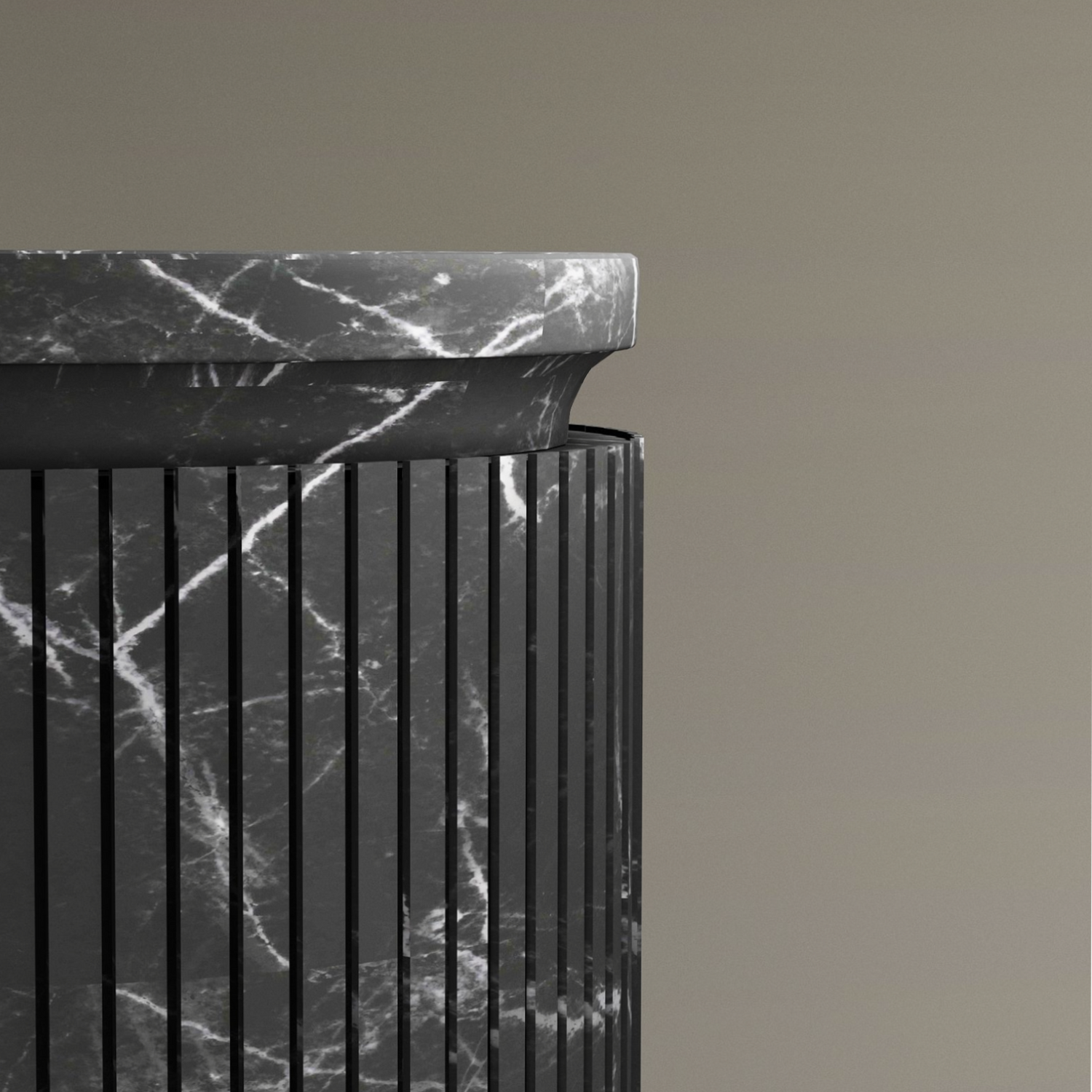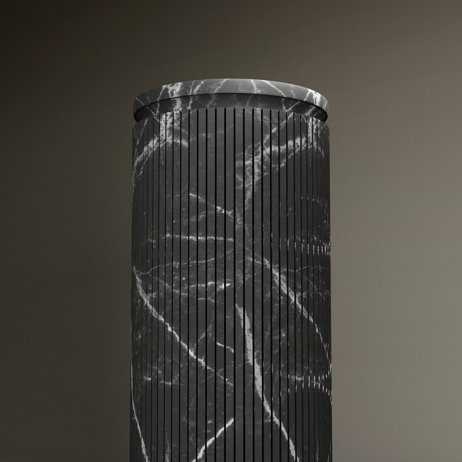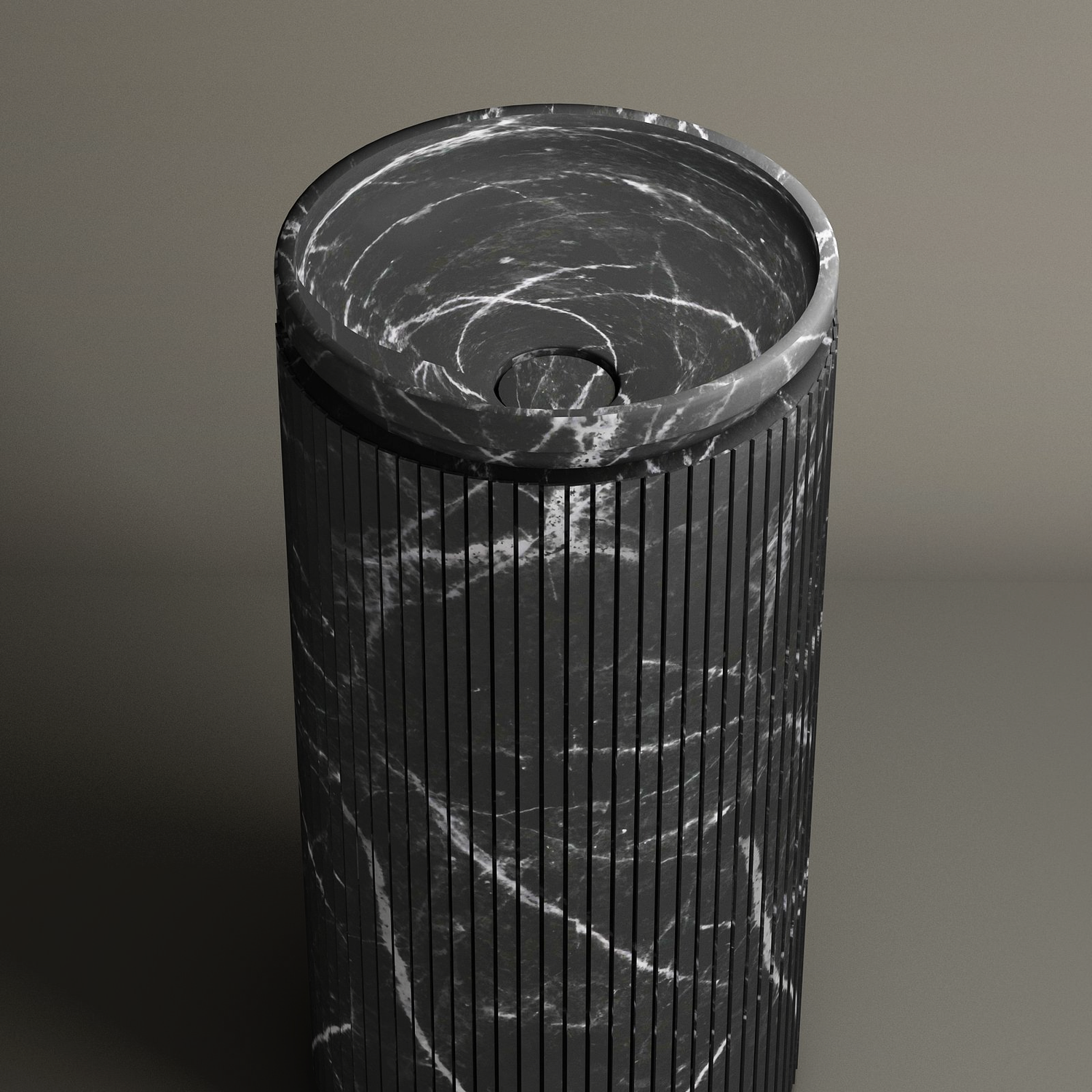 The TRAVERTABLE Nero Marquina Round Marble Pedestal Vanity Sink, featuring vertical grooves and white veining, stands upright with a matching flat lid on a neutral background—ideal for stylish bathroom design.