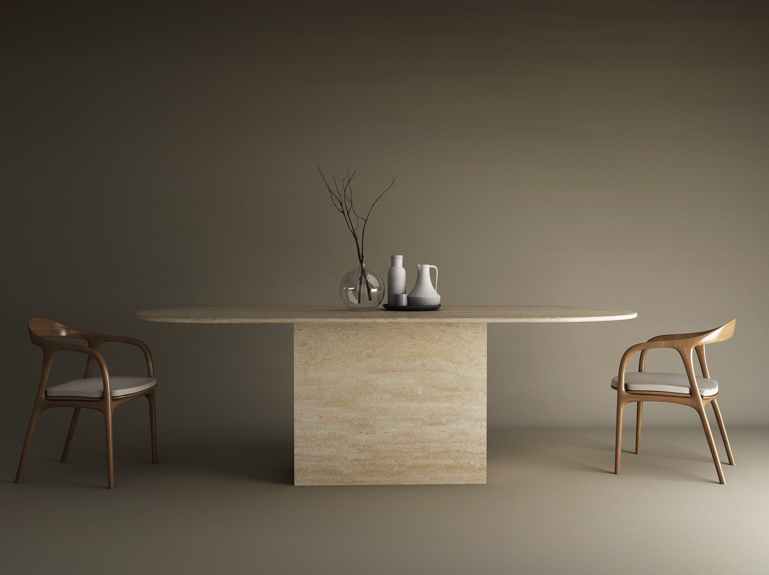 A minimalist dining space showcases the TRAVERTABLE Oval Travertine Dining Table with Block Base, two cushioned wooden chairs, and decorative vases with bare branches, all set against a plain beige background.