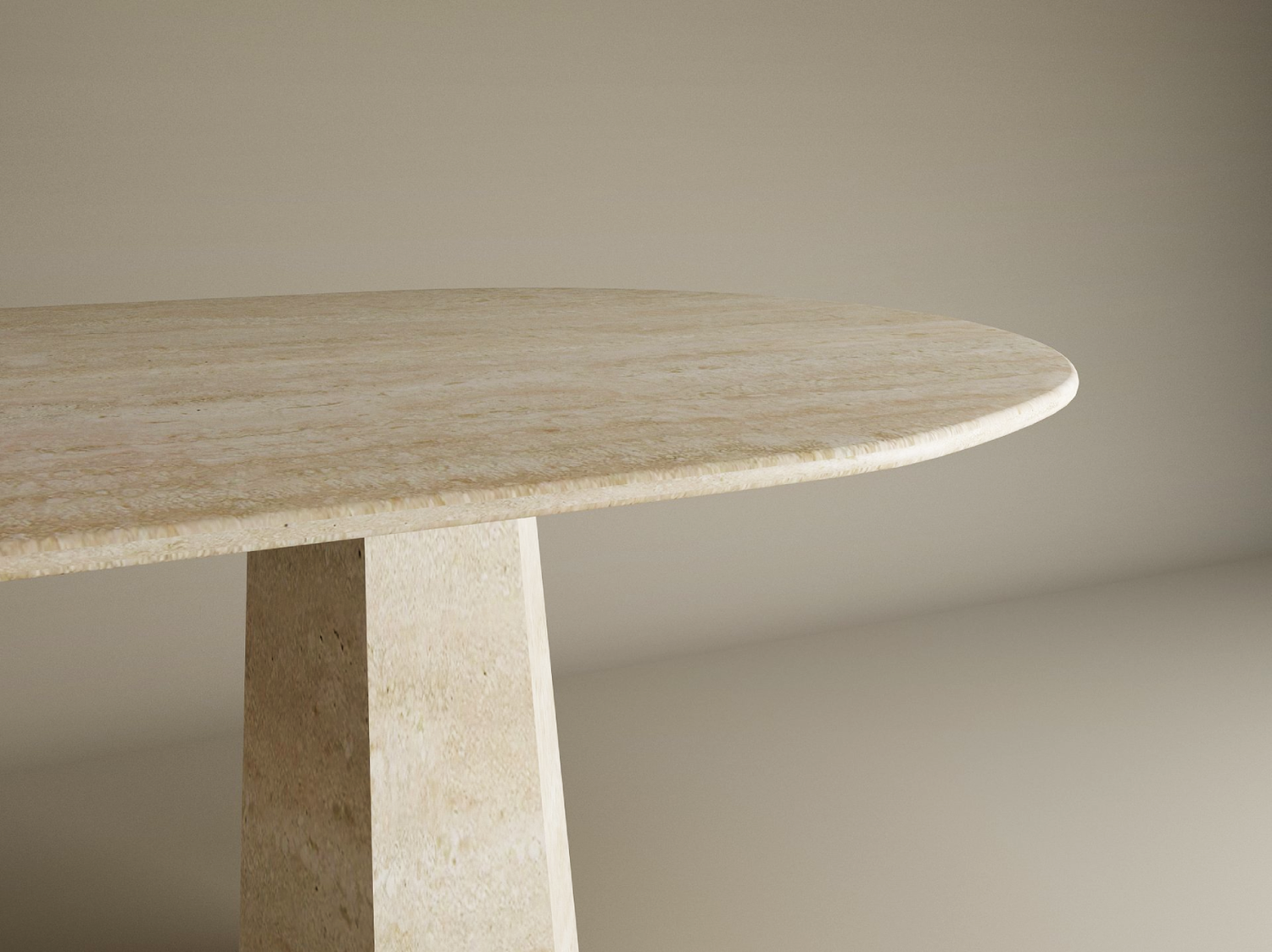 You can tell it was crafted with care and precision. The way the sloped pedestal meets the oval travertine top is seamless, the veining is thoughtfully matched, and the edges are polished to a smooth, even finish. It feels sturdy and perfectly balanced without looking bulky.