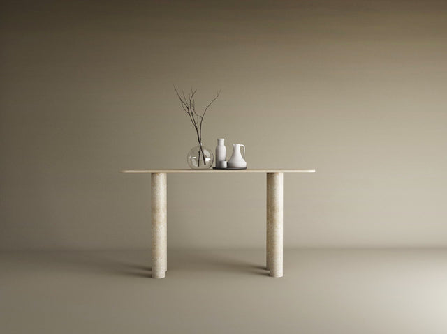 Grounded by a pure travertine cylindrical base, this console table marries organic material with architectural form. Sized at 59 x 14 x 32 inches (150 x 35 x 82 cm), it’s an elegant yet striking anchor for your entryway or living area.