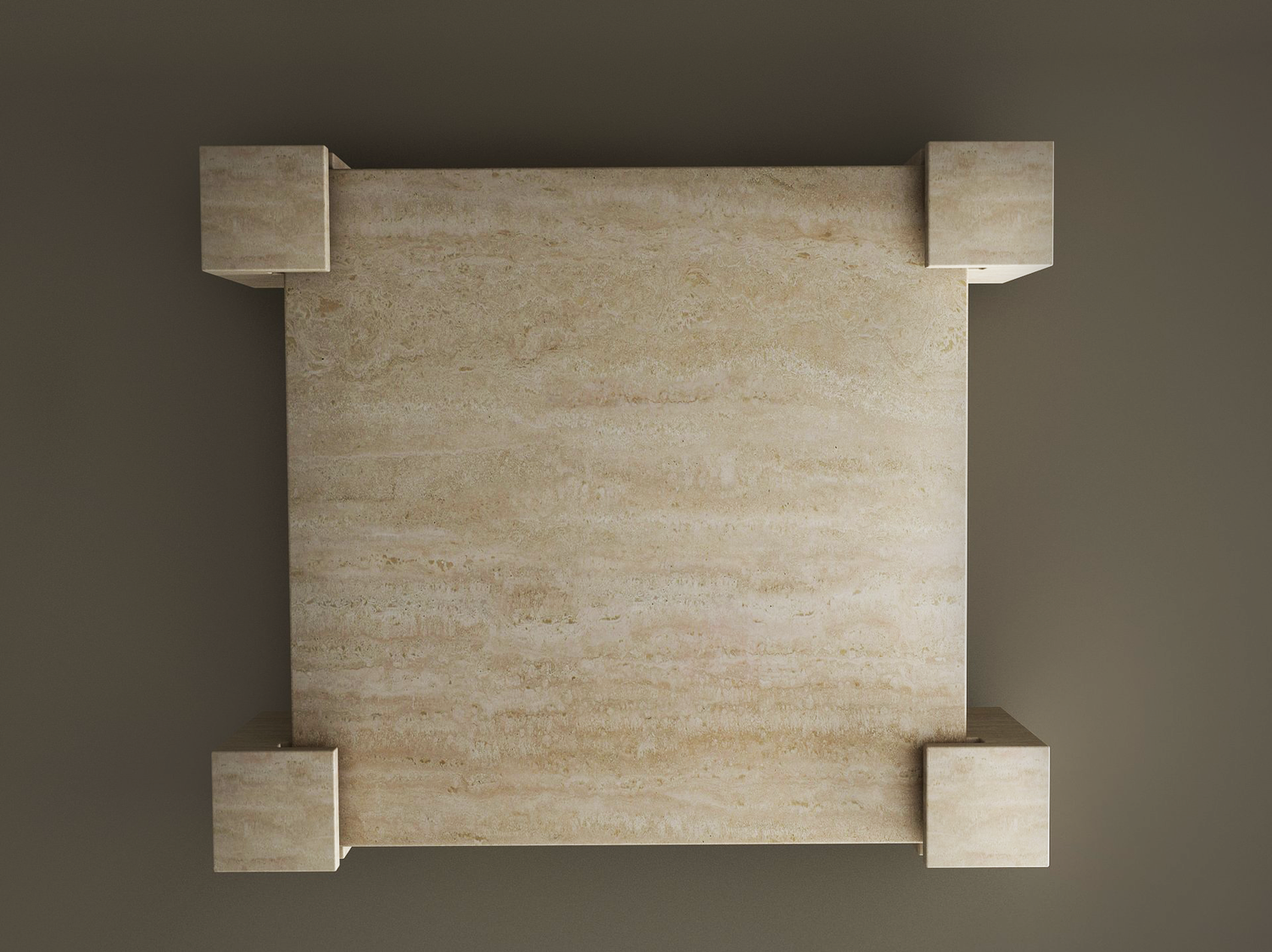 Embrace quiet luxury with this square travertine coffee table, featuring strong square bases that anchor the natural stone top in a seamless, minimalist form. Sized at 43 x 43 x 14 inches (110 x 110 x 36 cm), this piece exudes timeless elegance and grounding calm, making it an heirloom-worthy addition to your modern living space.