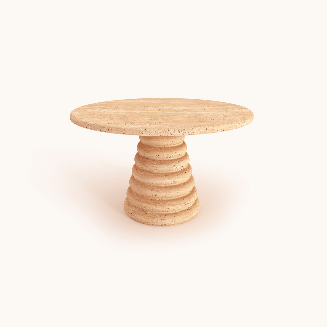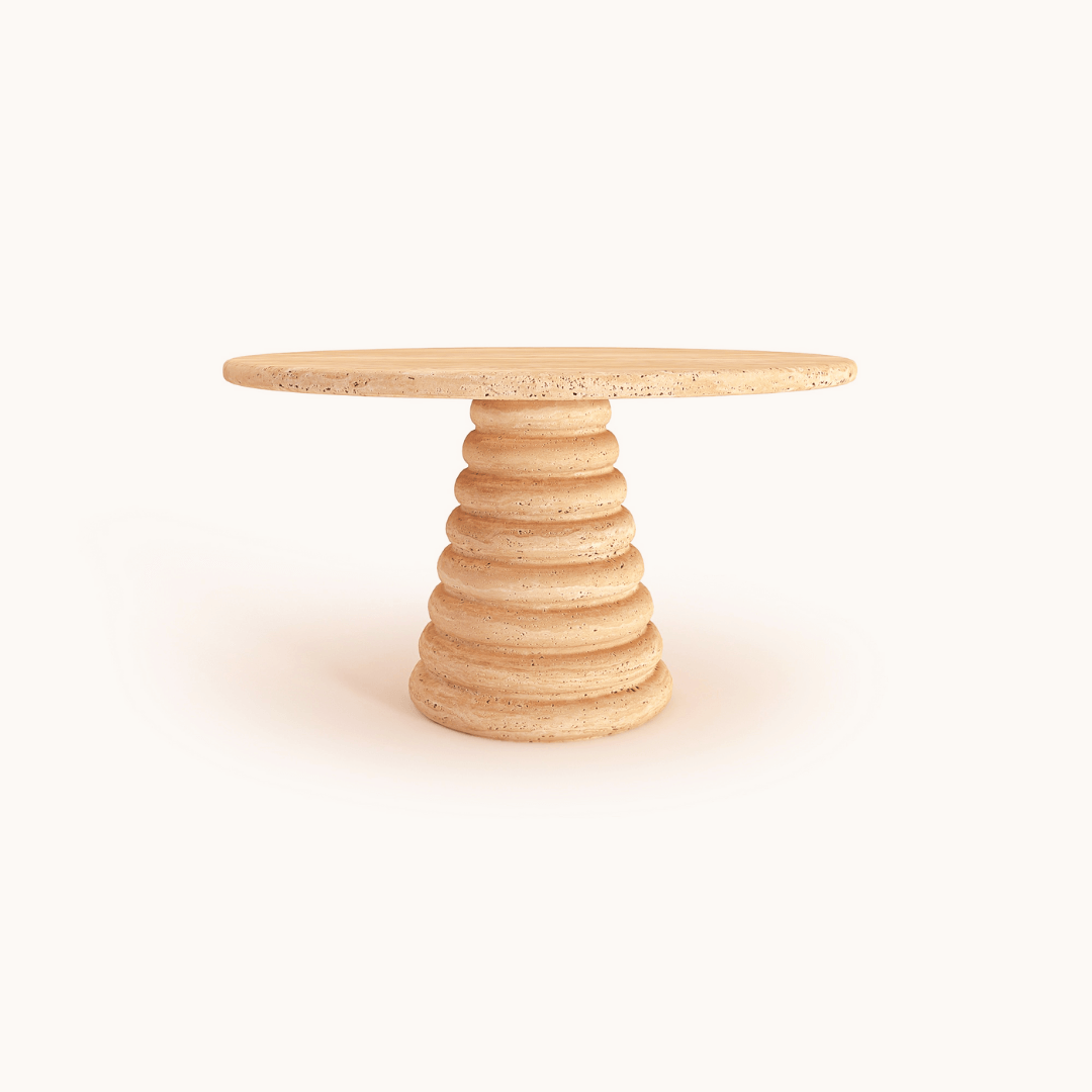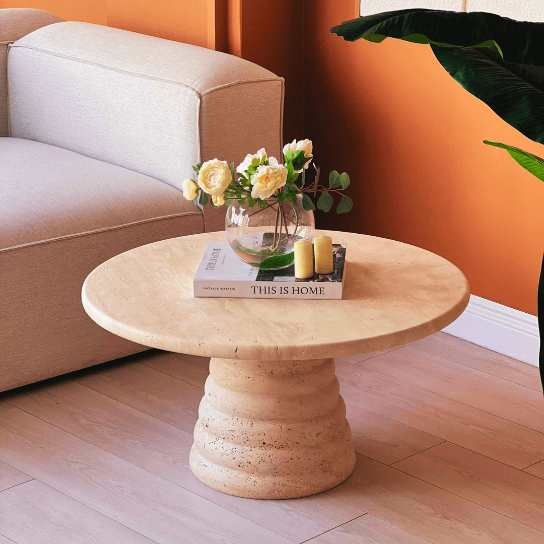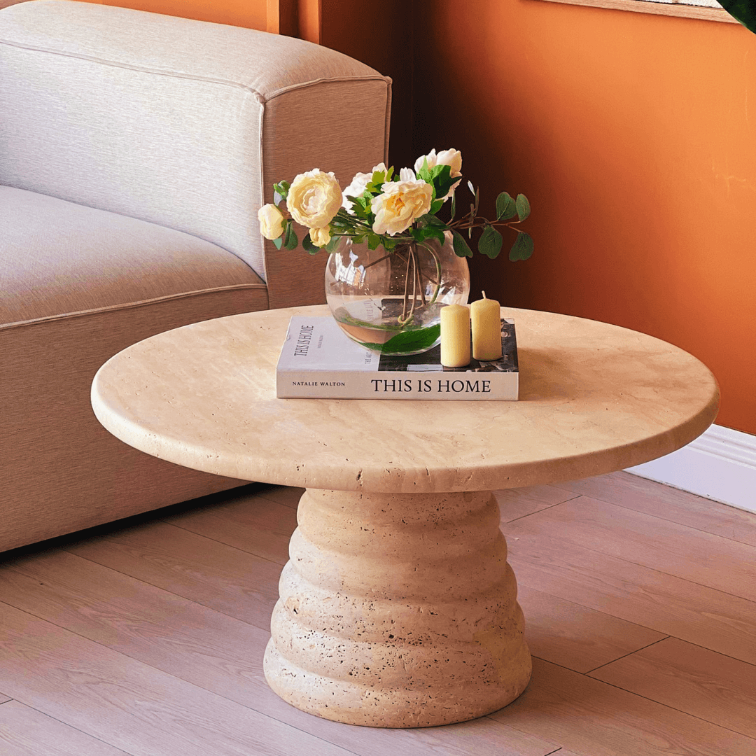 Elevate your space with this Designer Travertine Marble Coffee Table, a true statement piece that combines artistry with utility. Featuring a robust circular top made from the finest travertine marble, this table showcases a striking grooved pillar base that not only supports the structure but also adds a dramatic flair.