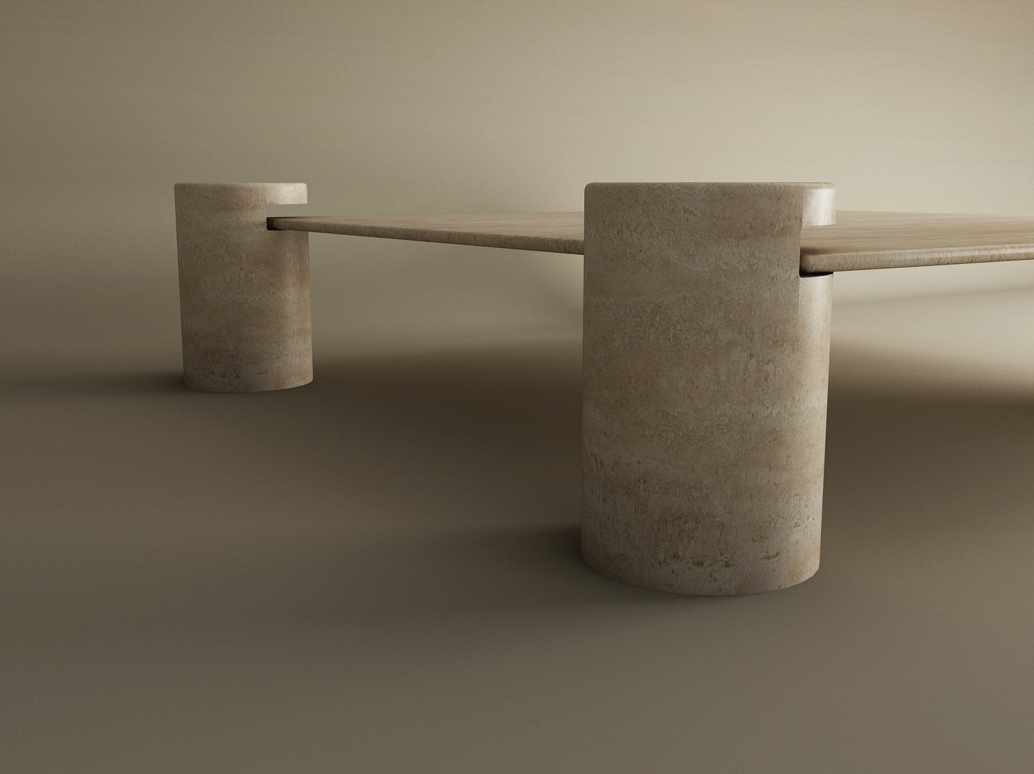 Invite quiet calm and a touch of refined strength to your home with this square travertine coffee table, featuring solid cylindrical bases. Sized at 43 x 43 x 14 inches (110 x 110 x 36 cm), this timeless piece brings a sense of grounded tranquility and modern elegance to your living space.