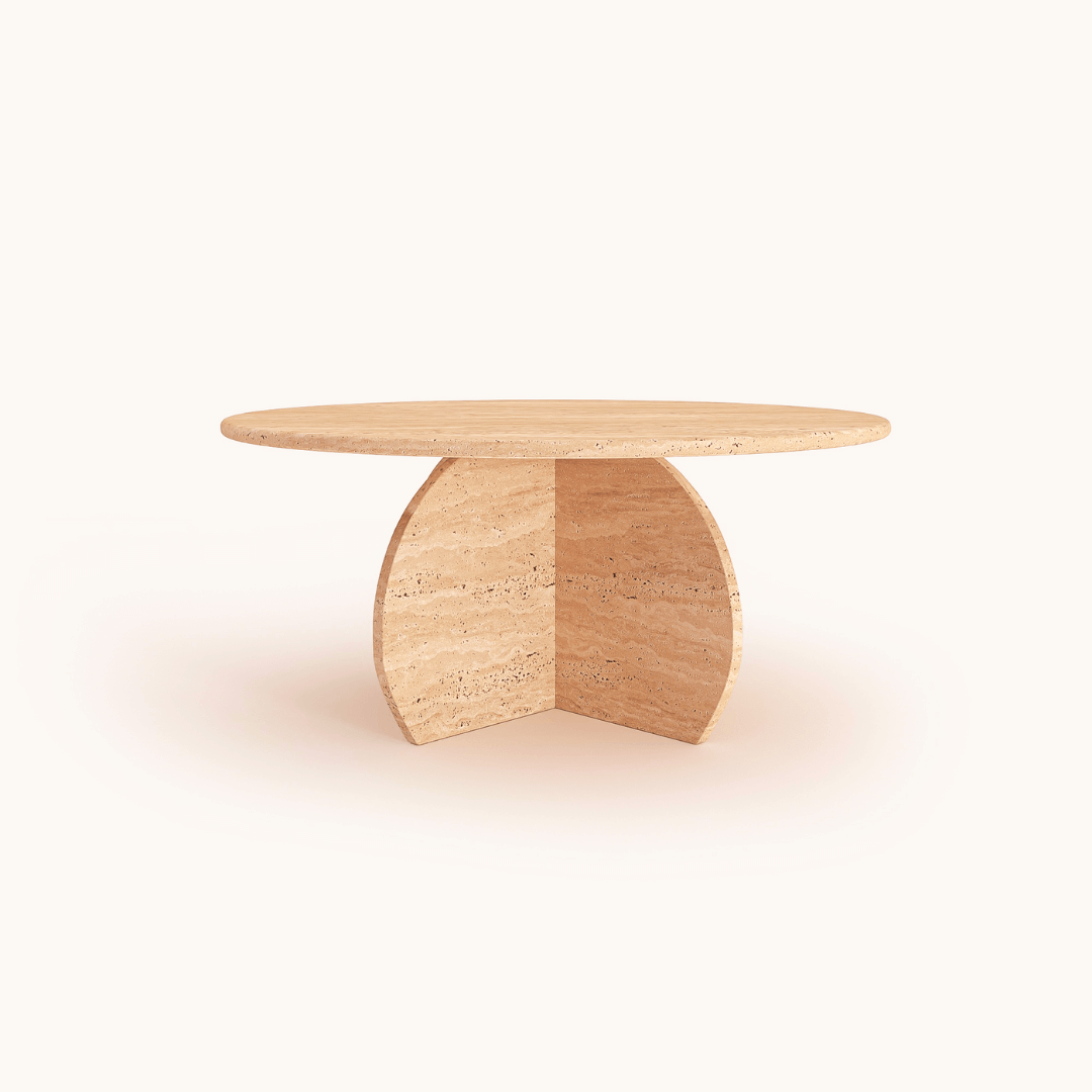 The Stone Essence Travertine Coffee Table by Travertable features a round, light brown wooden tabletop presenting timeless design and natural beauty. Its cross-shaped base maintains a wood texture, offering a monolithic modern design set against a white background.