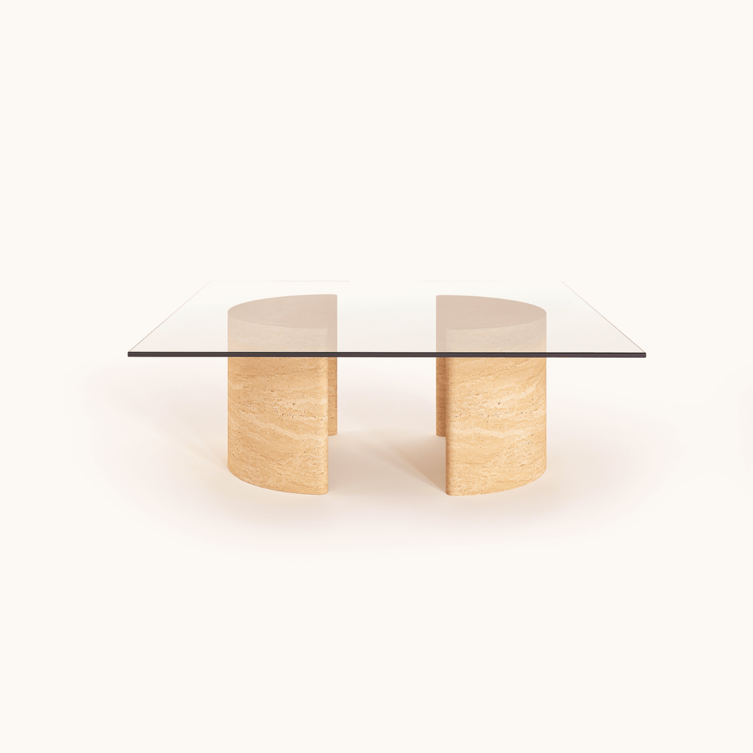 This coffee table embodies contemporary elegance with its clear glass top that allows the robust, cylindrical travertine bases to take center stage. It's a piece that celebrates the harmony of materials and design, offering both visual transparency and tactile warmth.