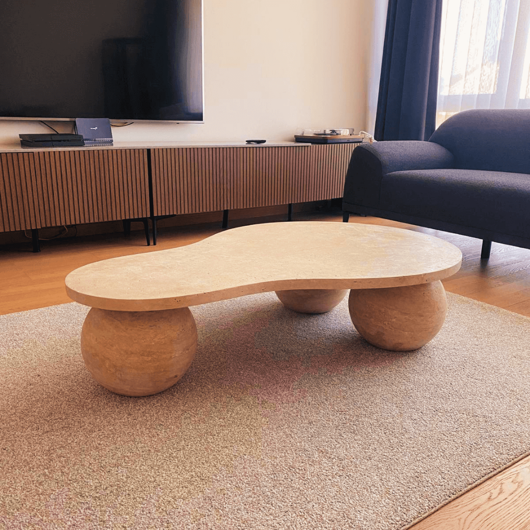 Discover the Tranquil Stone Travertine Coffee Table by Travertable, featuring a sleek, modern design with organic stone textures and three spherical legs on a light gray background. This table is both visually stunning and a durable addition to any décor.