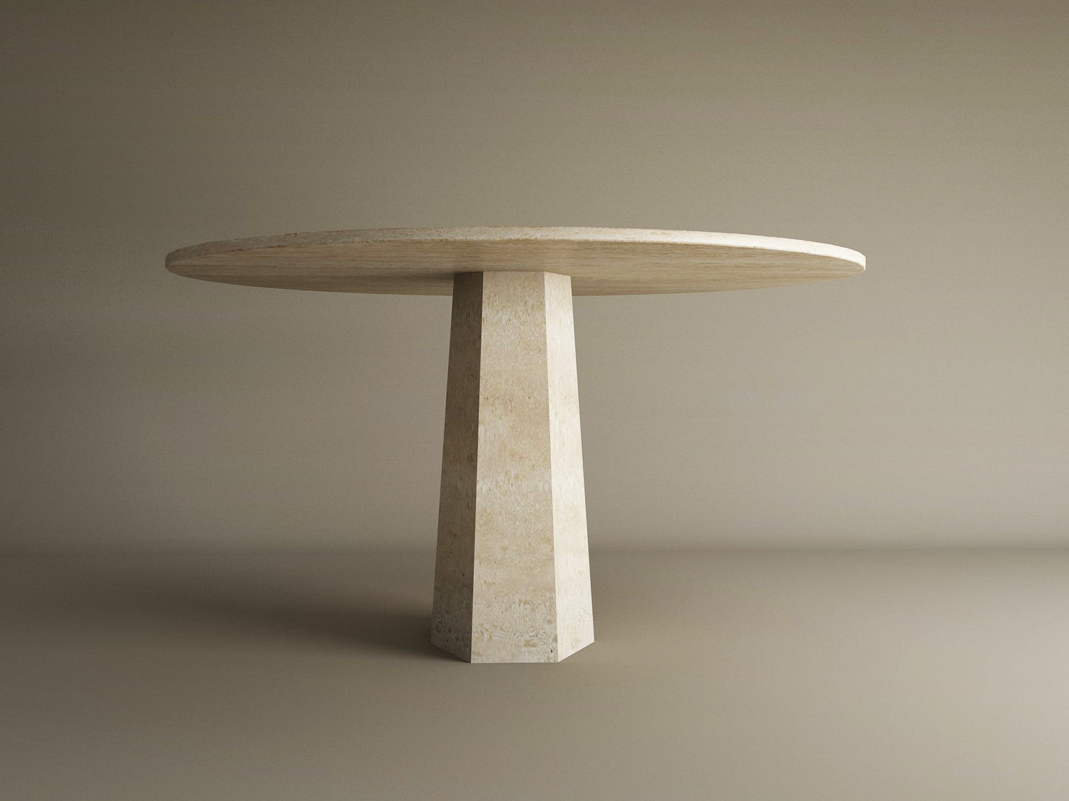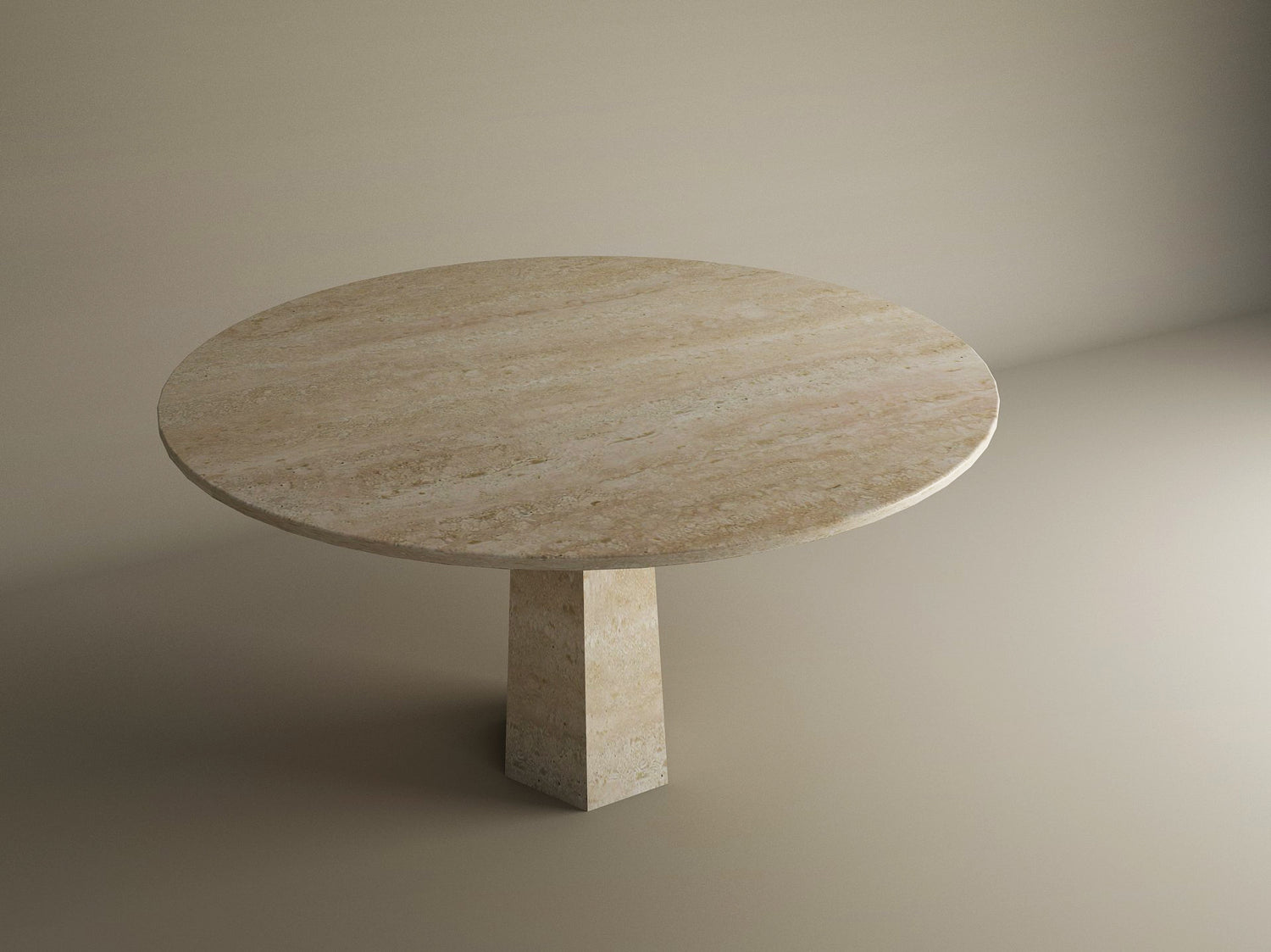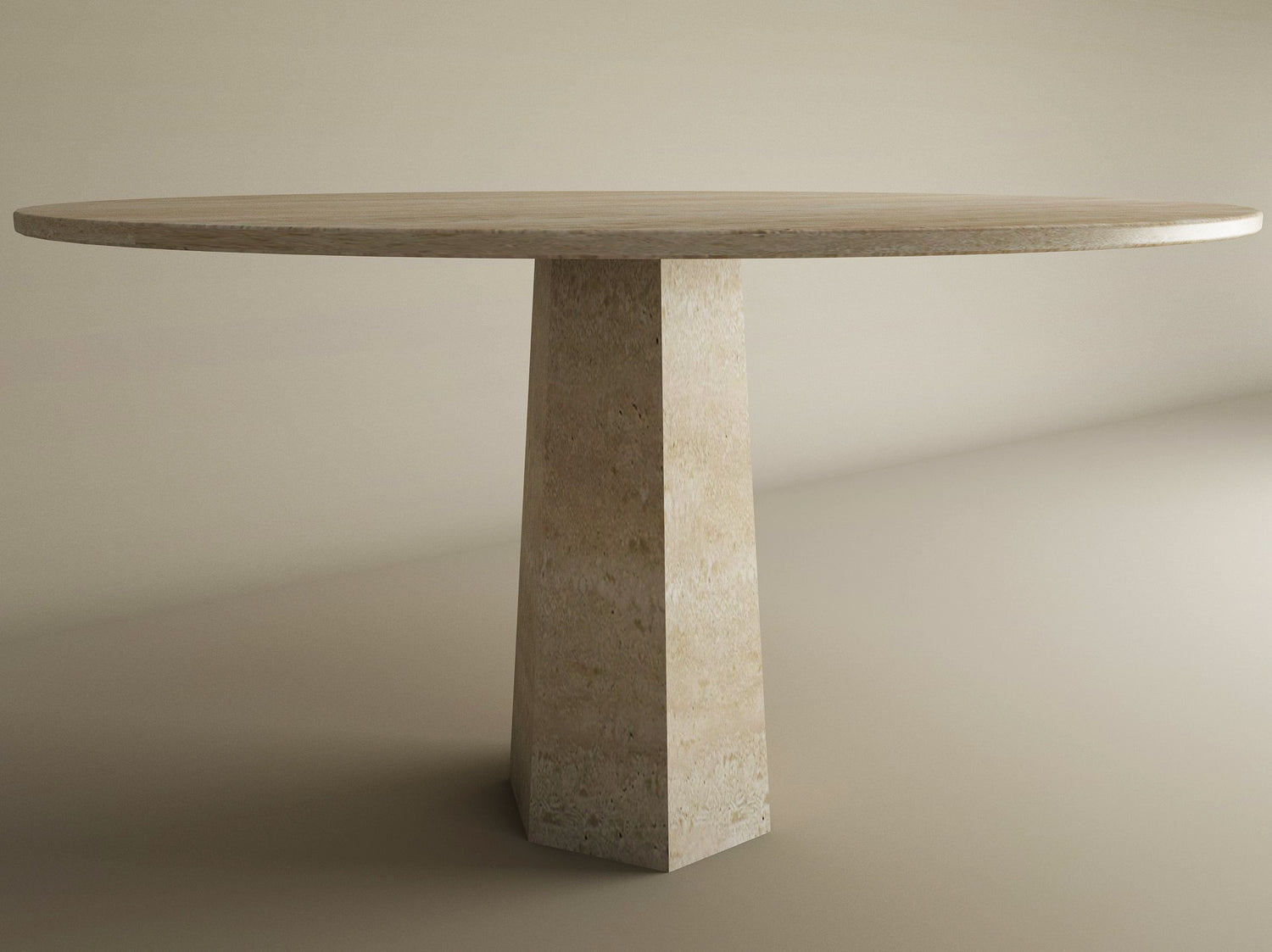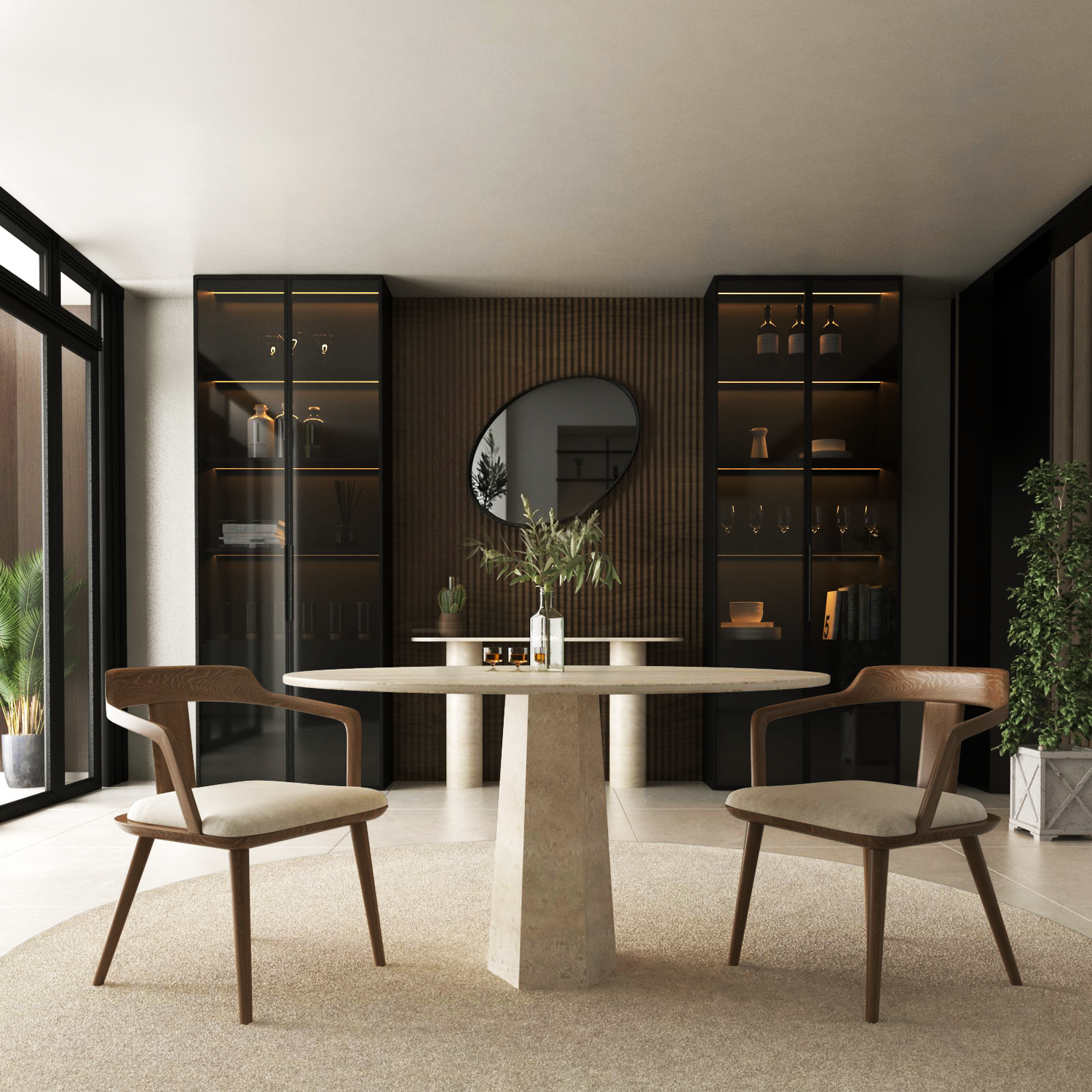 Sculptural elegance meets natural warmth in this round travertine dining table. The single tapered round base adds a sense of quiet drama, while the travertine tabletop radiates a soft, earthy glow. It’s a space to gather, to slow down, to be present. Every table is an individual work of art—one-of-a-kind, yet always an invitation to share life’s most meaningful moments.