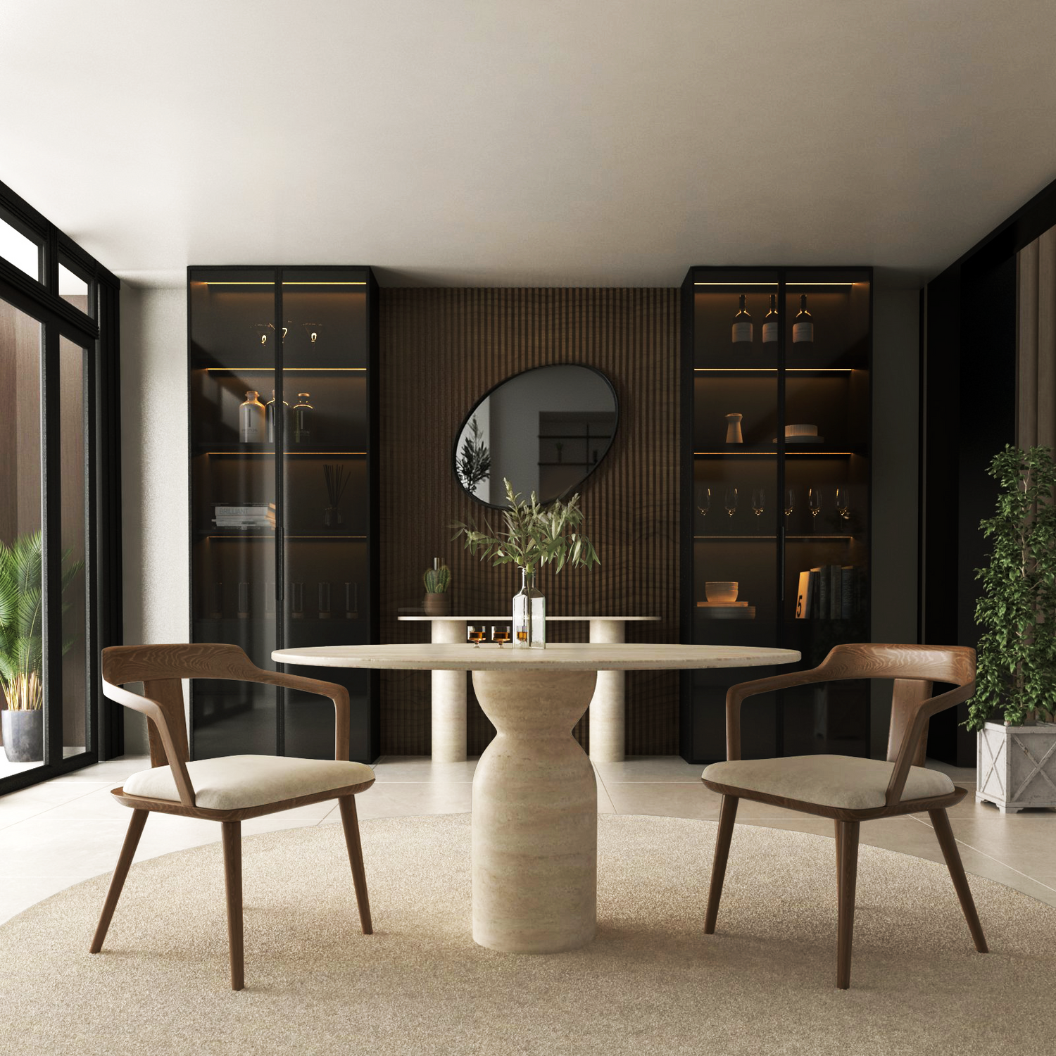 Understated elegance defines this round travertine dining table. A rectangular pedestal single base anchors the natural warmth of the stone top, offering a balance of form and function that speaks to a refined sensibility. It’s a place for lingering conversations and meals that stretch into the night, crafted to endure and be cherished by generations yet to come.