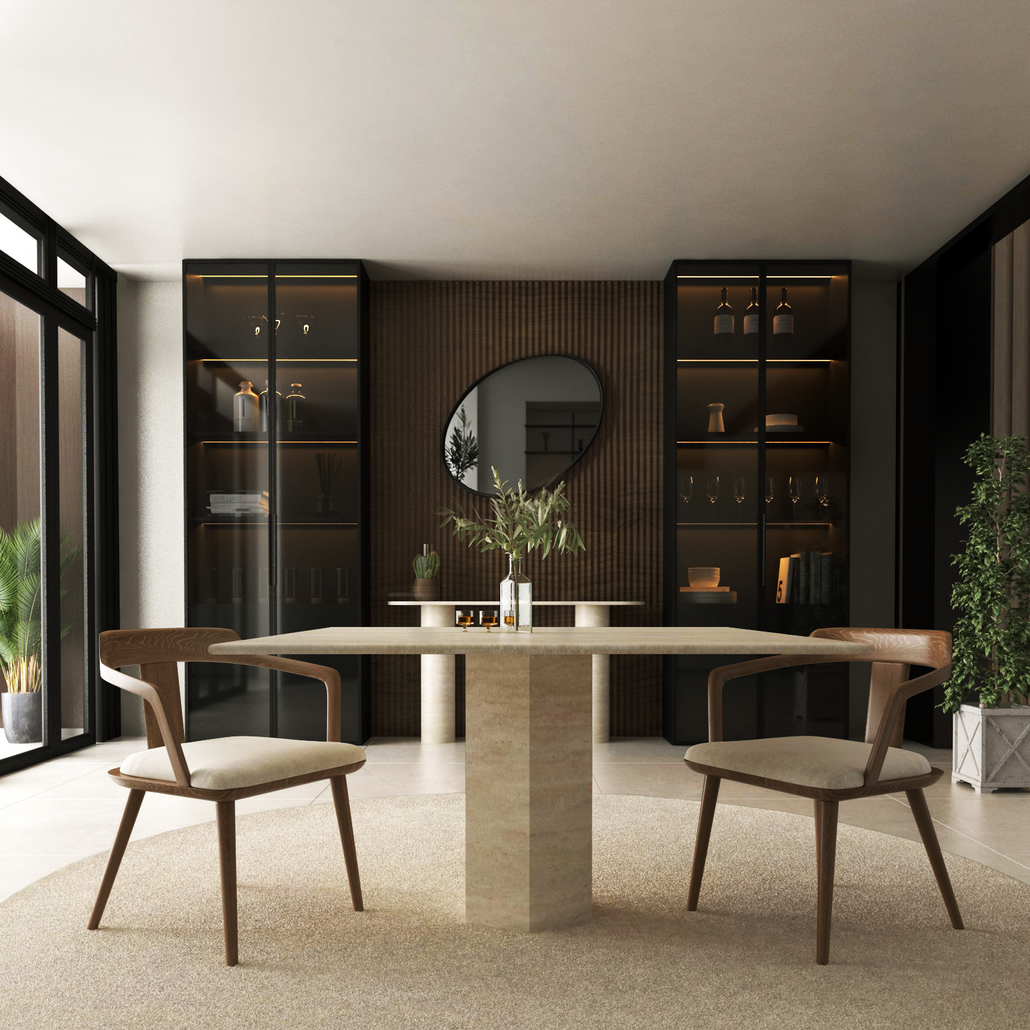 Character and quiet luxury meet in this square travertine dining table, grounded by a hexagonal pedestal single base. The natural stone top is softly veined, inviting touch and conversation, while the distinctive base shape sets it apart as a statement of calm confidence. Solid travertine ensures lasting strength, while the one-of-a-kind nature of each table brings an authenticity to your home that can’t be replicated. An heirloom piece in the making.