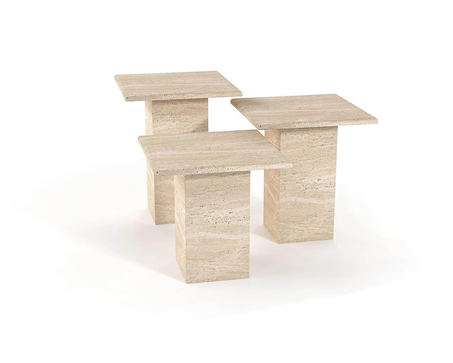Discover the "Travertine Tiered Ensemble," a sophisticated trio of side tables that capture the essence of modern design and the unique allure of natural stone.