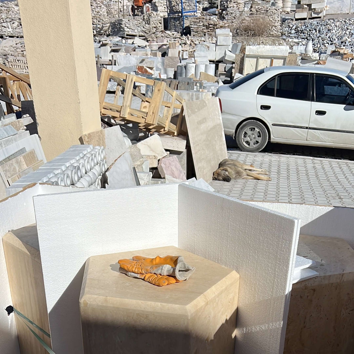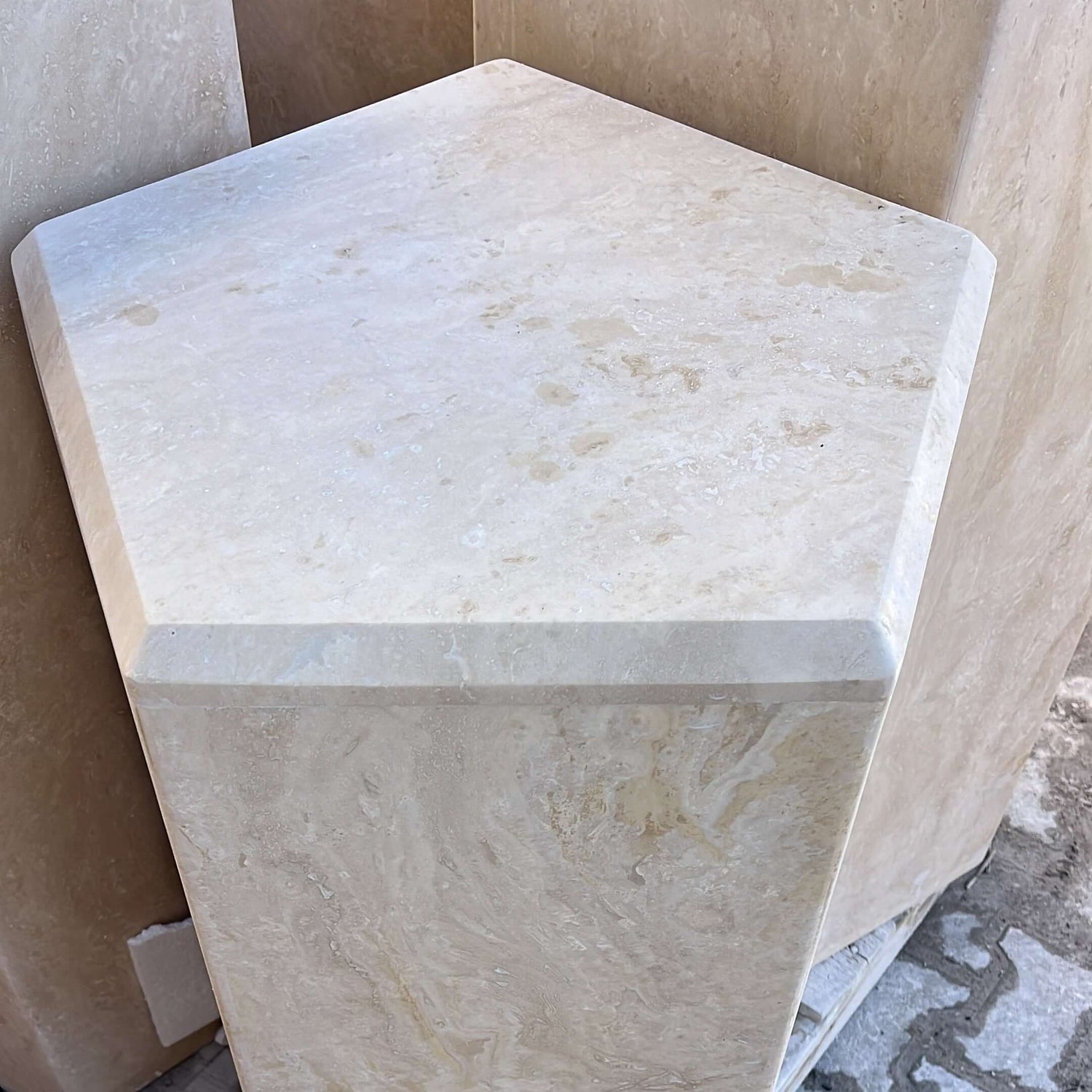 HexaForm and Pentagon Travertine Pedestal – Geometric Elegance in Natural Stone