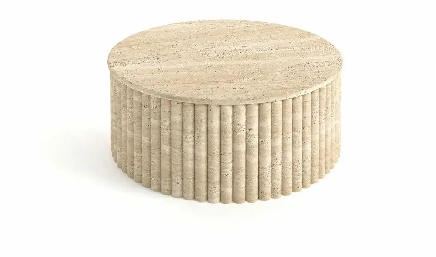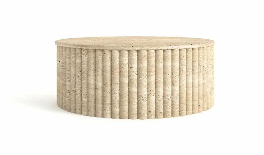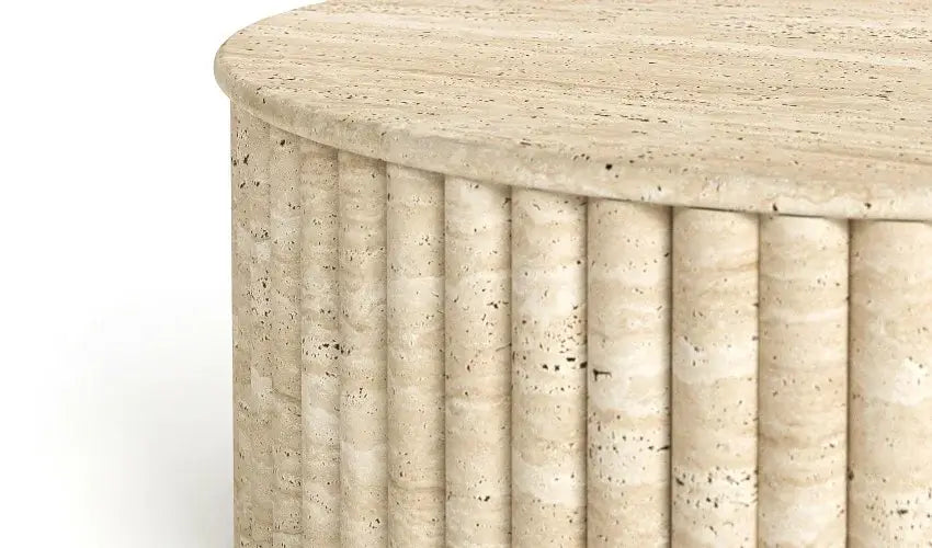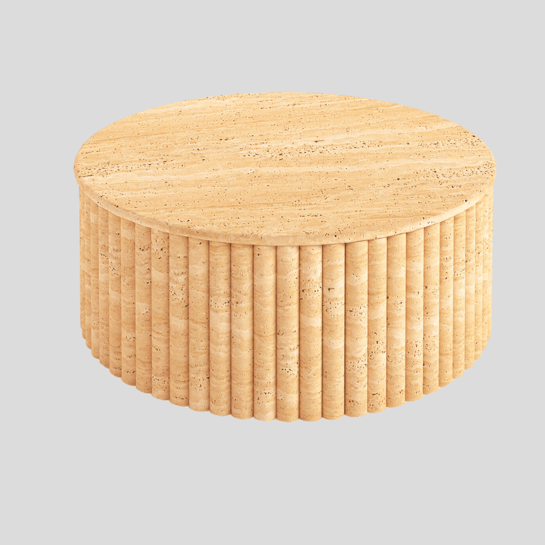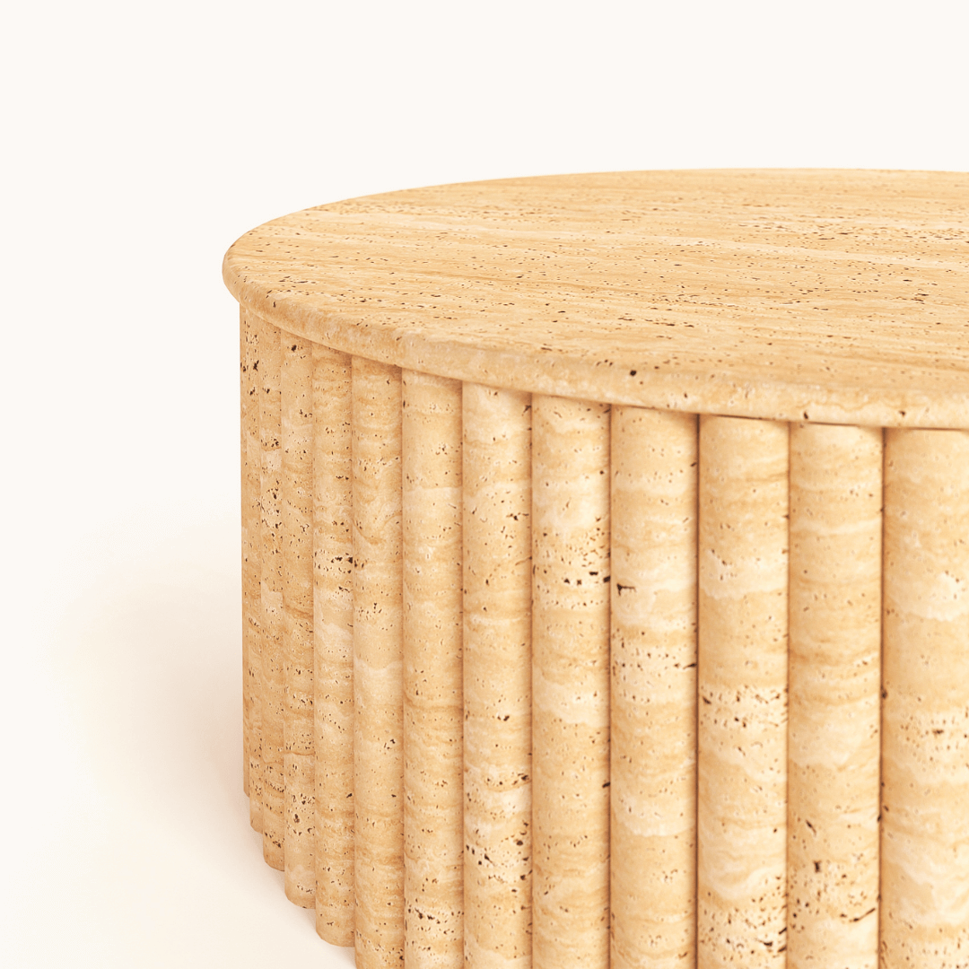 Crafted from 100% organic stone, this table brings the tactile pleasure of nature’s texture right into the heart of your home. The rounded, smooth top contrasts beautifully with the finely fluted sides, mirroring the rhythmic contours of distant mountain ranges. Its presence in a room is both commanding and inviting, offering a touch of rugged beauty polished to a refined elegance.