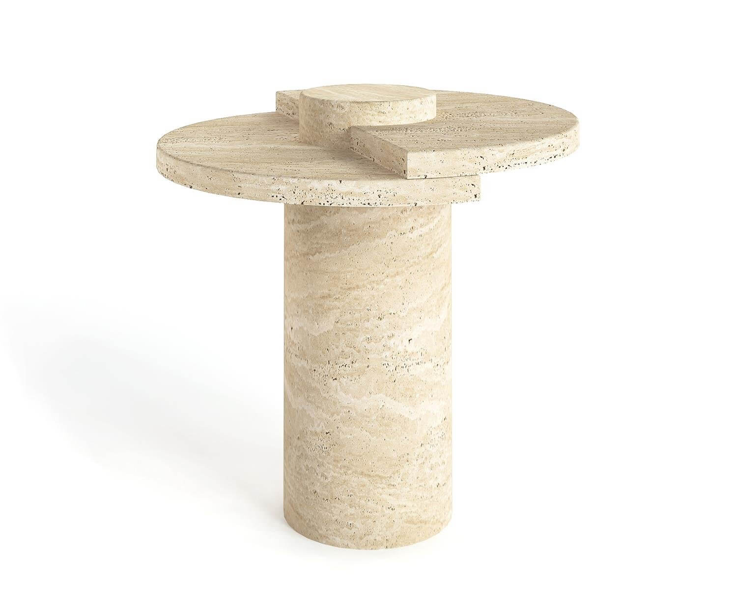 Introducing the "AuraStone Elegante," an exquisitely crafted tiered side table that epitomizes the fusion of artisanal mastery with the serene sophistication of natural stone. Designed to enrich refined spaces, the AuraStone Elegante features a sumptuous travertine top spanning 55 cm (approximately 21.7 inches) in diameter, supported by a robust cylindrical base with a matching height, creating a harmonious vertical symmetry. This piece is not merely a furnishing but a centerpiece that embodies the essence of luxury and tailored artistry.
